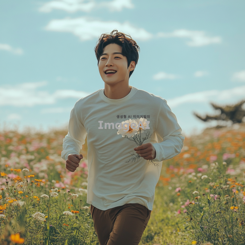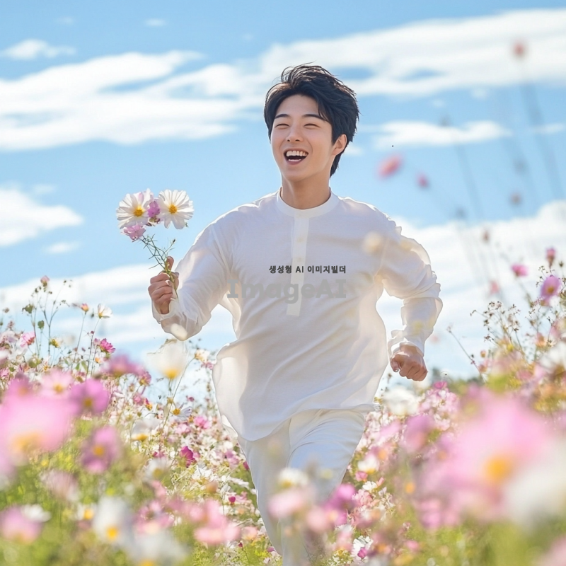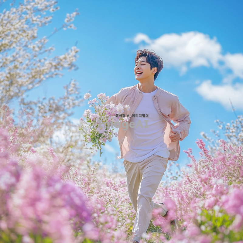 아름다운 꽃밭에서 사랑스러운 한국인 남성이 예쁜 꽃을 들고 달려가는 모습, 그의 표정은 설렘과 기대감으로 가득 차 있고, 배경은 화창한 날씨와 푸른 하늘, 다채로운 꽃들이 만개한 풍경, 로맨틱한 분위기.