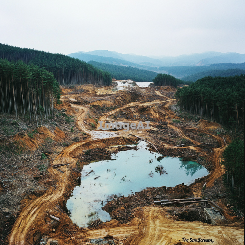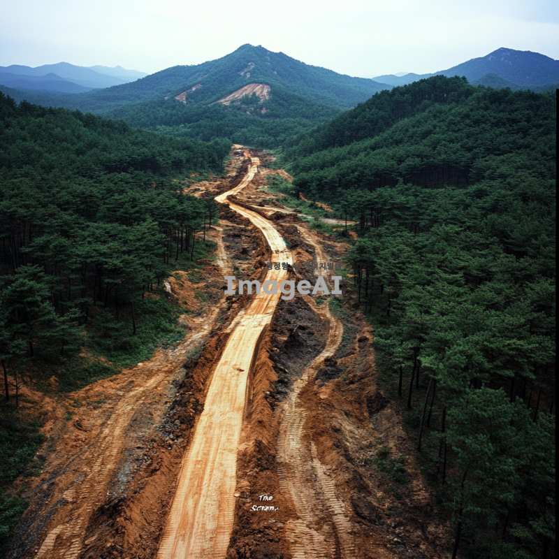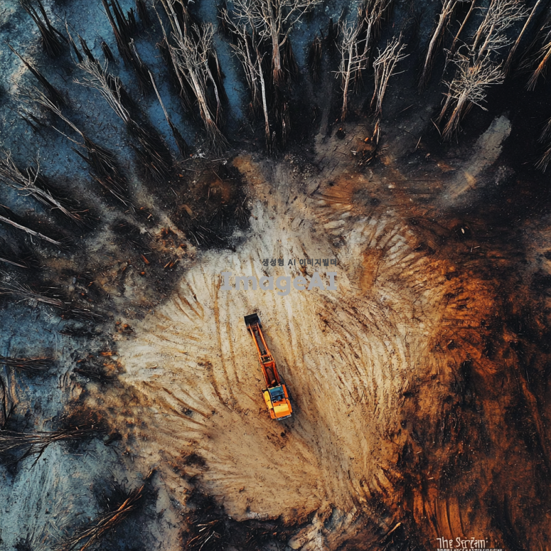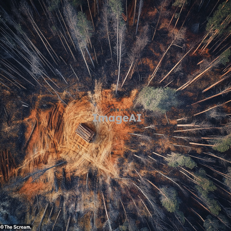 하늘에서 바라본 벌목 현장, 뭉크의 절규를 연상시키는 형태로 나무들이 베어지고 있는 모습, 강렬한 색감과 감정이 담긴 풍경, 나무들이 쓰러지는 모습과 함께 고요한 자연의 대조, 한국의 숲을 배경으로 한 장면