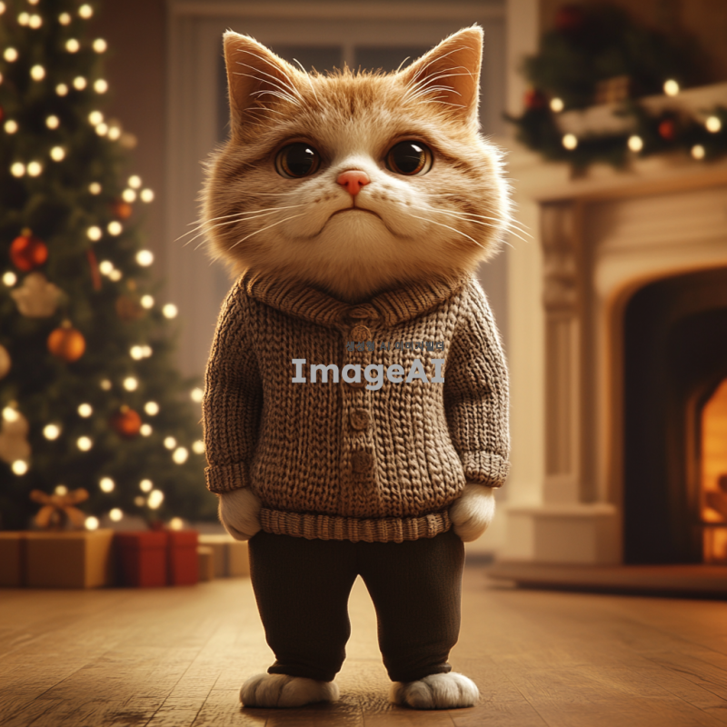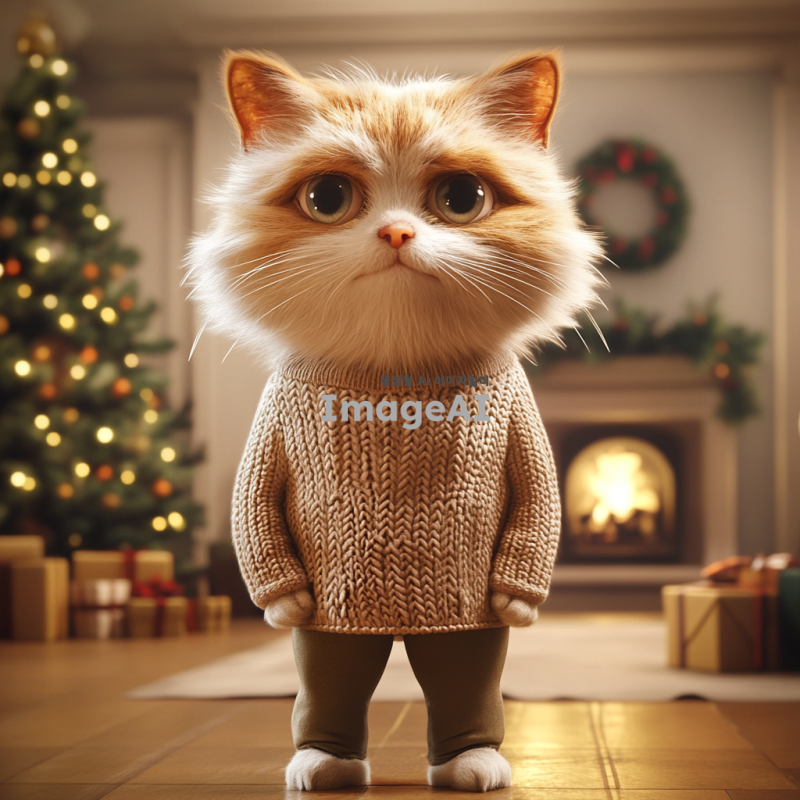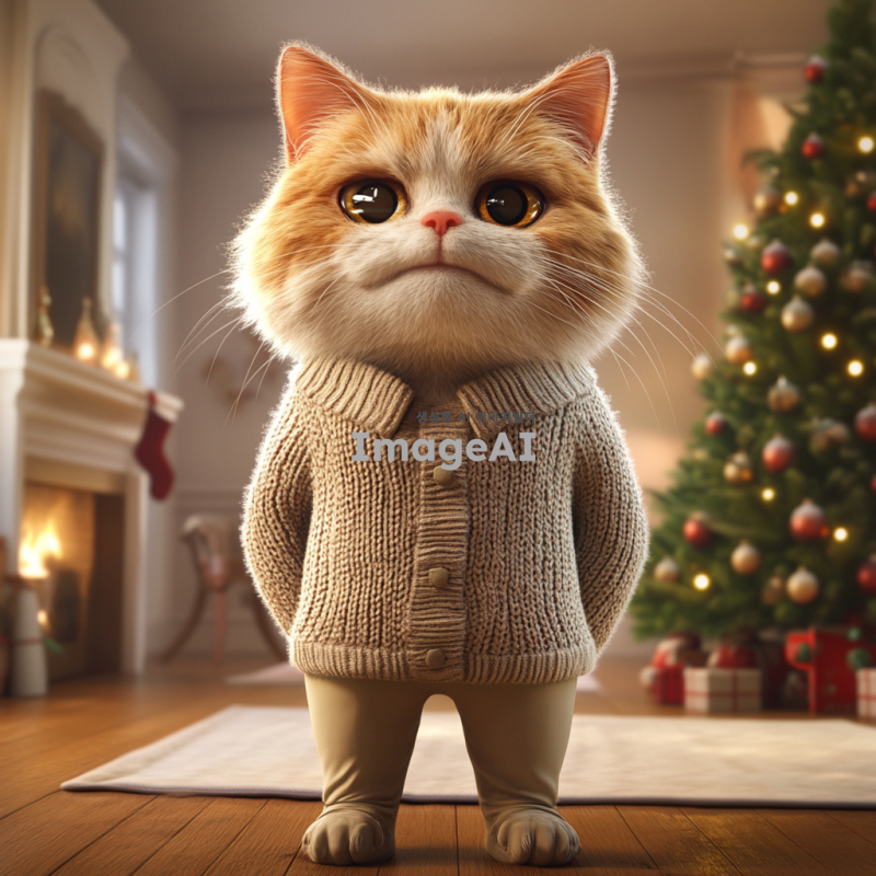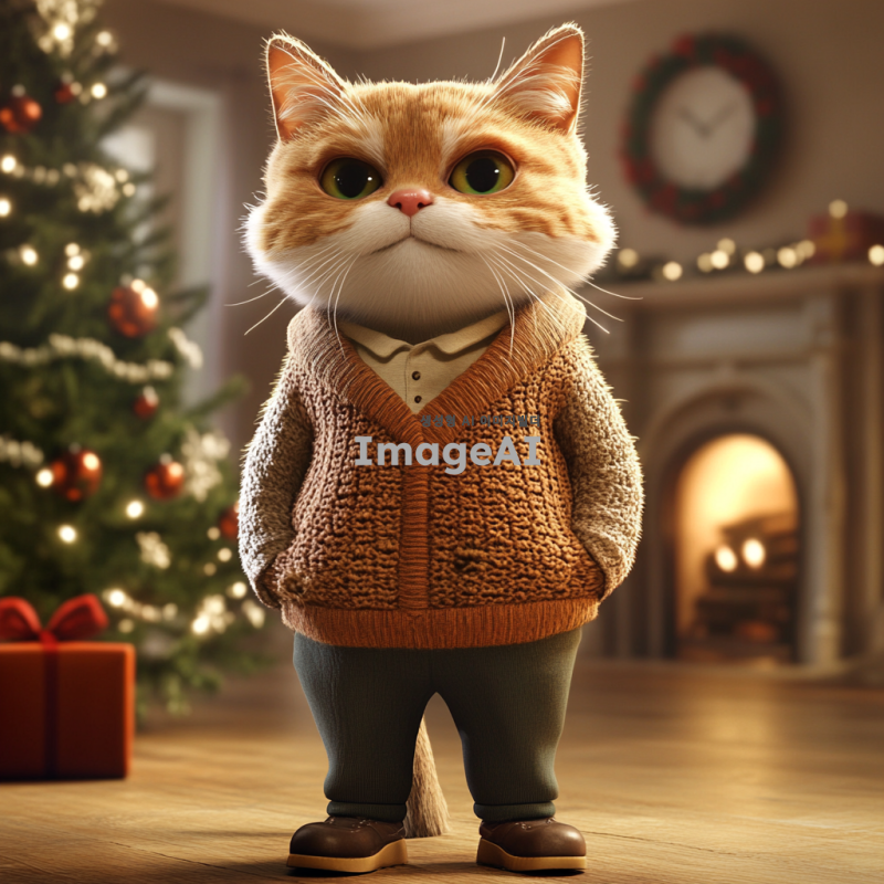 고양이 할아버지가 두 발로 서서 스웨터를 입고 있는 모습. 나이가 많아 보이며 힘이 없는 느낌을 주고, 의인화된 고양이의 특성을 살림. 배경은 넓은 거실로, 한쪽에는 크리스마스 트리가 있고, 벽난로가 있는 따뜻한 분위기. 3D 애니메이션 스타일로 표현된 장면.