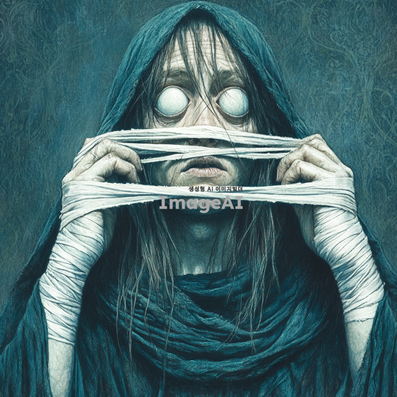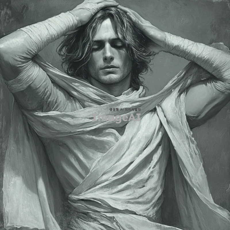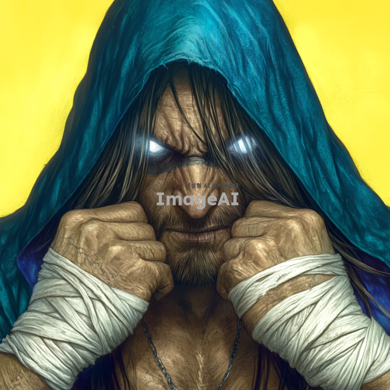 남자에 장발이고, 흰색 눈, 양손에 붕대를 감고, 후드 망토를 쓰고 있으면서 후드 망토를 벗는 모습