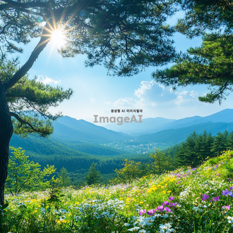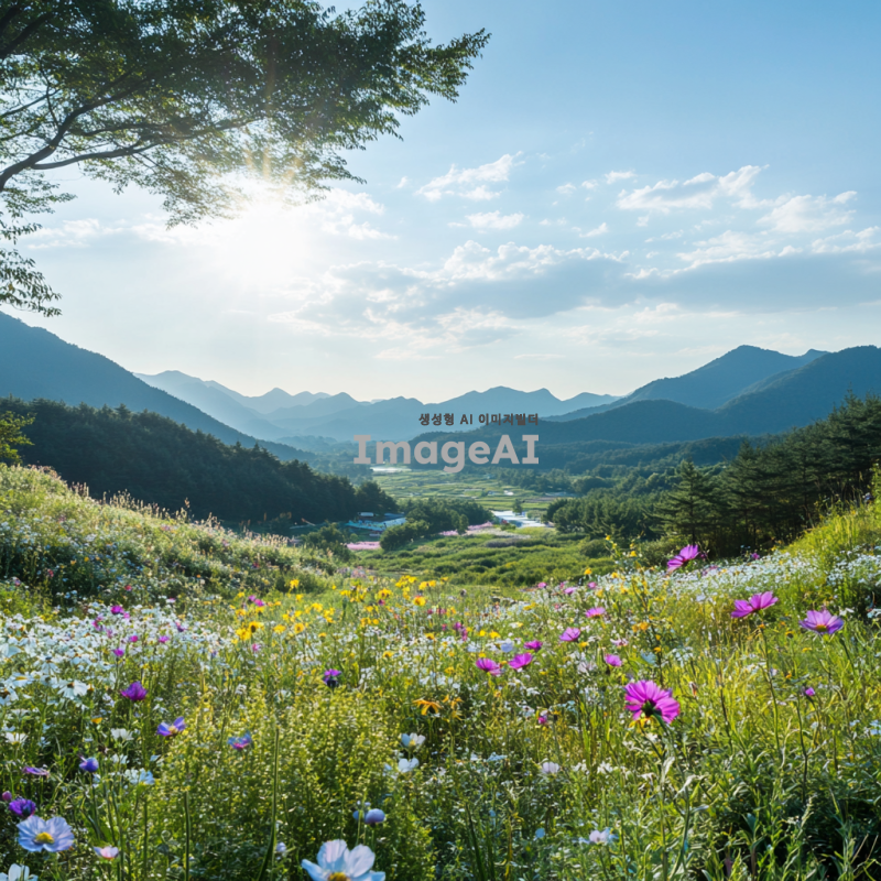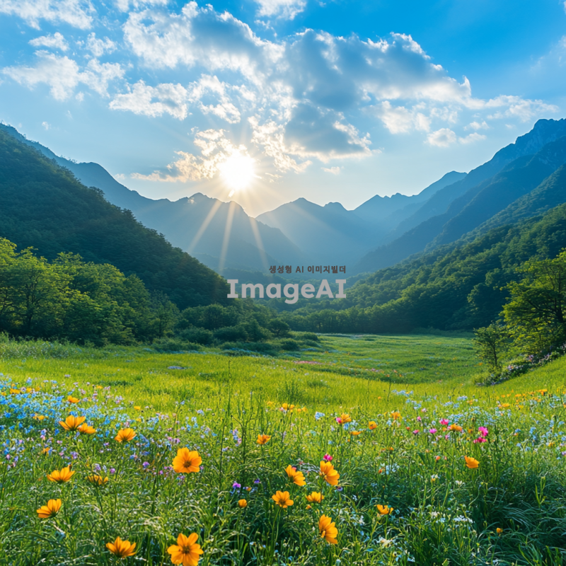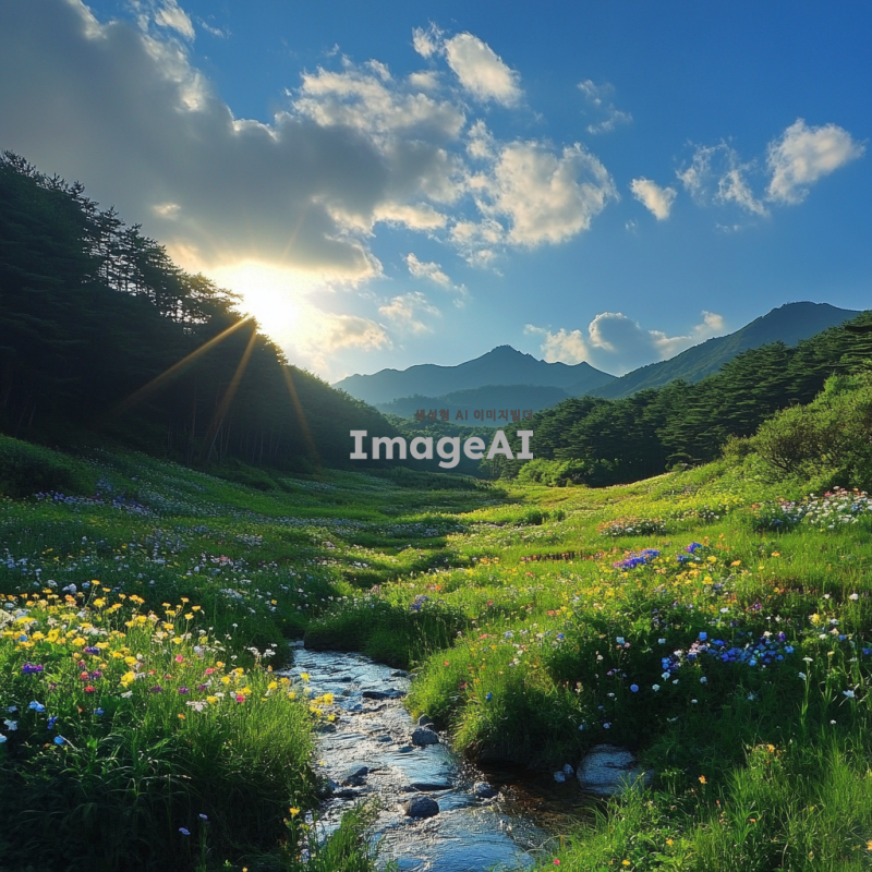 푸른 숲속의 맑은 계곡, 햇빛이 나뭇잎 사이로 비추며 반짝이는 물결, 다양한 색깔의 꽃들이 만발한 들판, 멀리 보이는 산봉우리와 푸른 하늘, 평화롭고 조용한 자연의 풍경, 한국의 전통적인 요소가 가미된 자연 환경