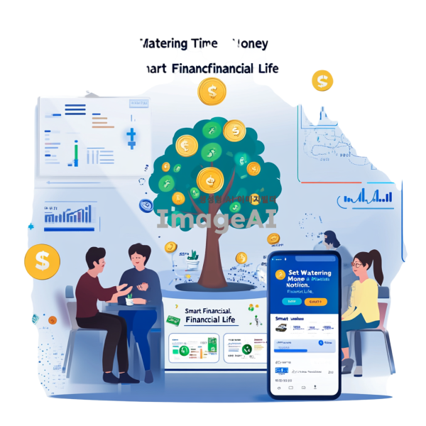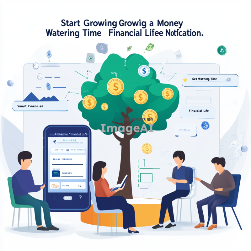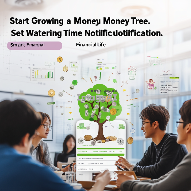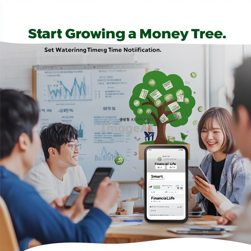 처음 앱테크를 시작하는 사람들과 친구들이 함께 즐거운 표정으로 돈나무 키우기를 하는 모습. 주변에 ‘스마트 금융 생활’이라는 문구가 적혀 있다.