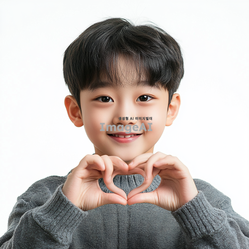 손하트를 만들고 있는 한국 소년의 모습. 소년은 밝은 표정을 지으며, 사랑스러운 느낌을 주는 의상을 입고 있다. 배경은 없이 소년만 강조된 이미지.