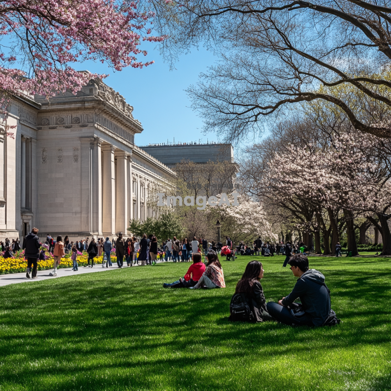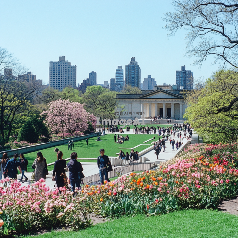 메트로폴리탄 미술관의 봄 풍경, 화사하게 피어난 꽃들, 푸르른 잔디밭, 방문객들이 미술관 주변을 산책하고 있는 모습, 따뜻한 햇살이 비추는 아름다운 날, 고풍스러운 건축물과 현대 미술 작품이 조화를 이루는 장면, 생동감 넘치는 분위기, 한국인 가족이 함께 즐거운 시간을 보내는 모습