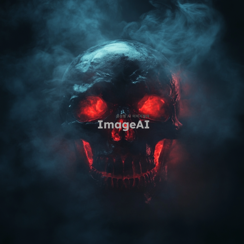 어두운 배경 속에서 붉은 빛을 발하는 눈을 가진 해골이 중앙에 위치하고 있으며, 그 주위를 감싸고 있는 신비로운 안개가 흐르고 있는 이미지. 해골의 표정은 위협적이며, 붉은 눈빛은 강렬하고 신비로운 느낌을 주고 있다. 전체적으로 음산하고 긴장감 있는 분위기를 연출하며, 어둠 속에서 빛나는 해골의 모습이 강조된다.
