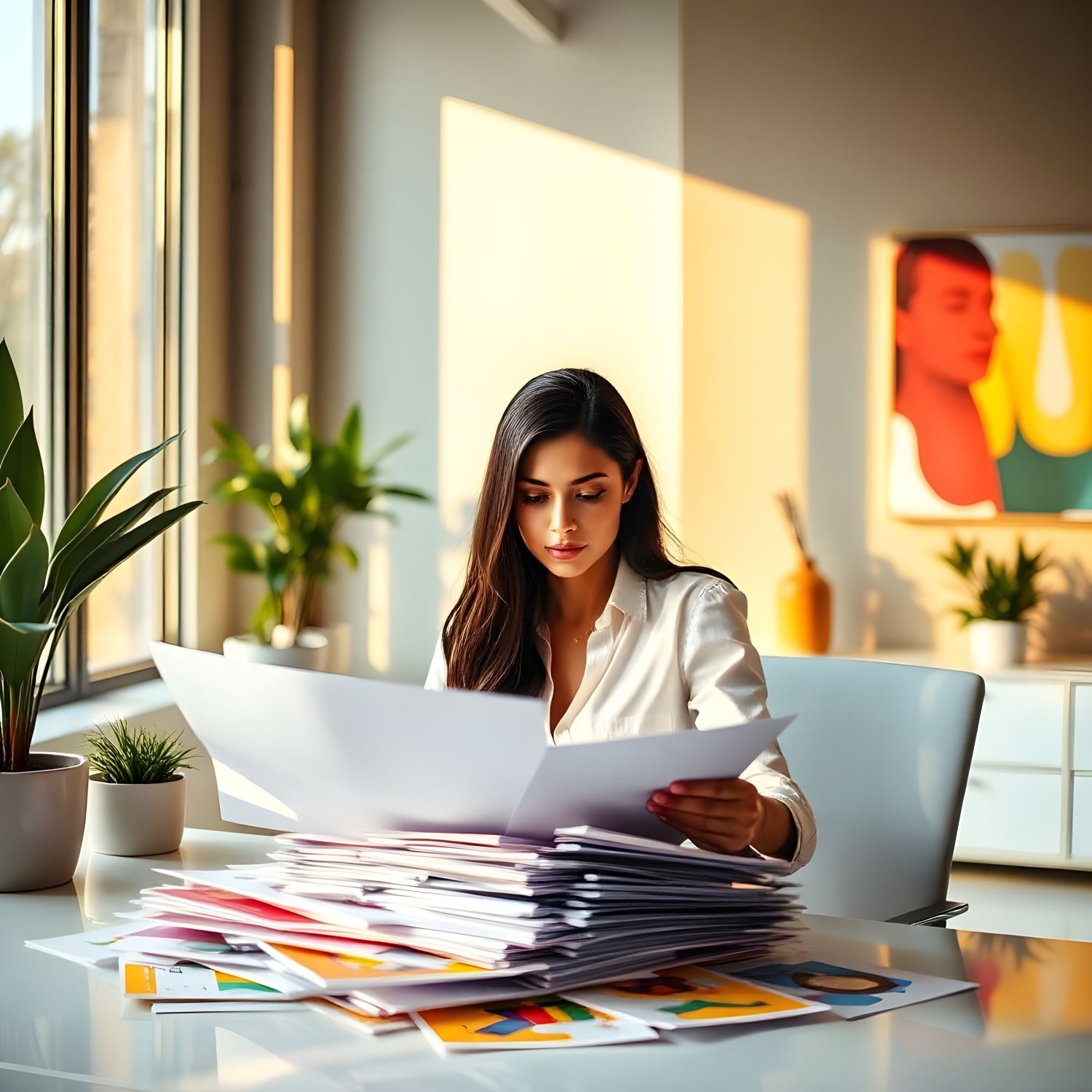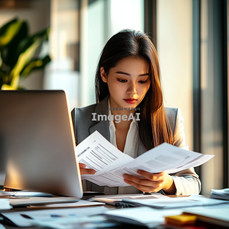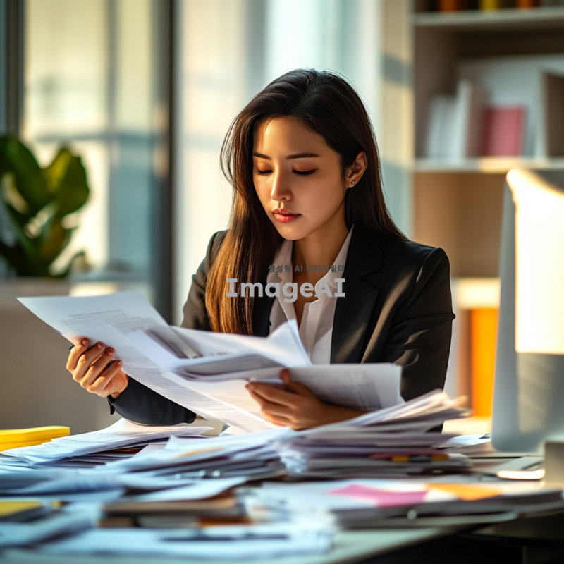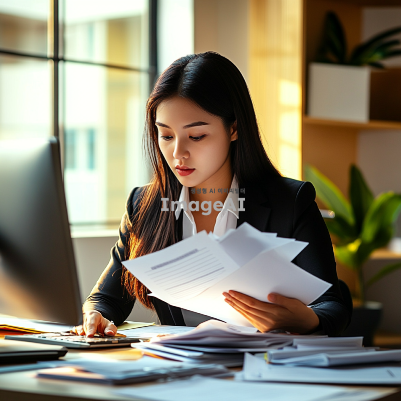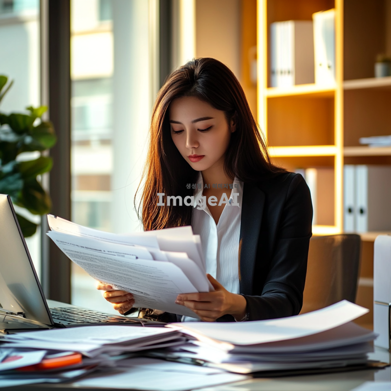 여성 사무직원이 서류를 보고 있는 모습, 현대적인 사무실 환경, 책상 위에 다양한 서류와 컴퓨터가 놓여 있음, 집중한 표정으로 서류를 살펴보는 모습, 한국인 여성, 정장 차림, 자연광이 들어오는 창가, 깔끔하고 정돈된 사무실 인테리어