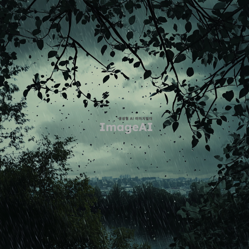 비가 내리는 하늘을 배경으로 한 풍경, 구름이 짙고 회색으로 가득 차 있으며, 빗방울이 떨어지는 모습이 보인다. 멀리 흐릿하게 보이는 도시의 실루엣과 함께, 물방울이 떨어지는 나뭇잎과 젖은 땅의 질감이 강조된 모습. 차분하고 우울한 분위기를 연출하며, 자연의 아름다움과 평화로움을 느낄 수 있는 장면.