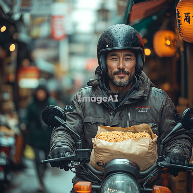배달 오토바이를 타고 파스타 음식 배달을 기다리는 한국인 고객에게 가는 모습, 도심의 거리 풍경, 오토바이의 역동적인 자세, 배달 가방에 파스타가 담겨 있는 모습, 고객은 기대에 찬 표정, 주변에는 다양한 음식점과 사람들이 있는 활기찬 분위기, 햇살이 비치는 따뜻한 날씨, 생동감 있는 색감