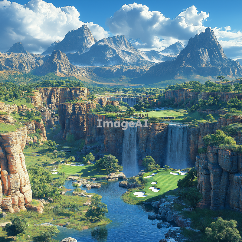 걸작, 최고 품질,초고화질, 세밀한 세부사항, 8k, 풍경 ,판타지, 광활한, 절벽 , 절경 , 골프장이 있다, 호수, 위에서 떨어지는 폭포, 지형 사이사이 절벽 및 수직구멍, 거꾸로 매달린 고드름처럼생긴지형, 에서 그랜드 캐니언처럼 생긴 산, 뒷배경은 넓은 로키산맥, 좌측배경과 우측배경 느낌다름