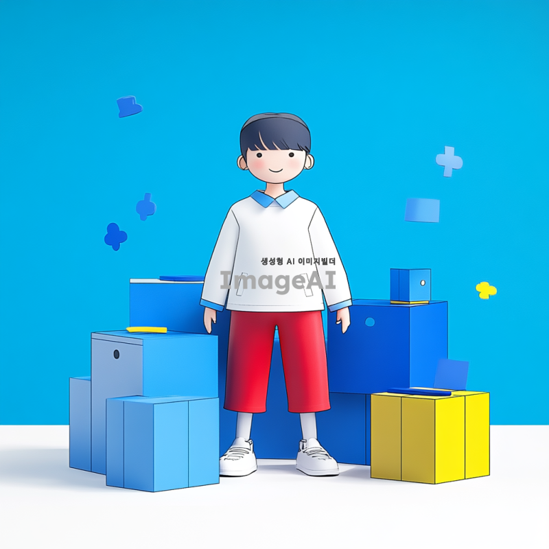한국인 캐릭터가 파란색 배경 앞에 서 있는 모습, 캐릭터는 밝고 즐거운 표정을 짓고 있으며, 주변에는 다양한 파란색 톤의 요소들이 어우러져 있는 장면. 캐릭터의 의상은 현대적이고 세련된 스타일로, 배경의 파란색과 조화를 이루는 디자인.