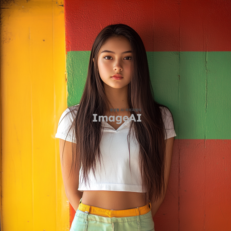 고등학생 여자, 예쁜 외모, 짧은 셔츠와 짧은 치마를 입고 있는 모습, 긴 생머리 스타일, 밝고 화사한 배경, 자연광이 비치는 분위기, 활기차고 젊은 느낌.