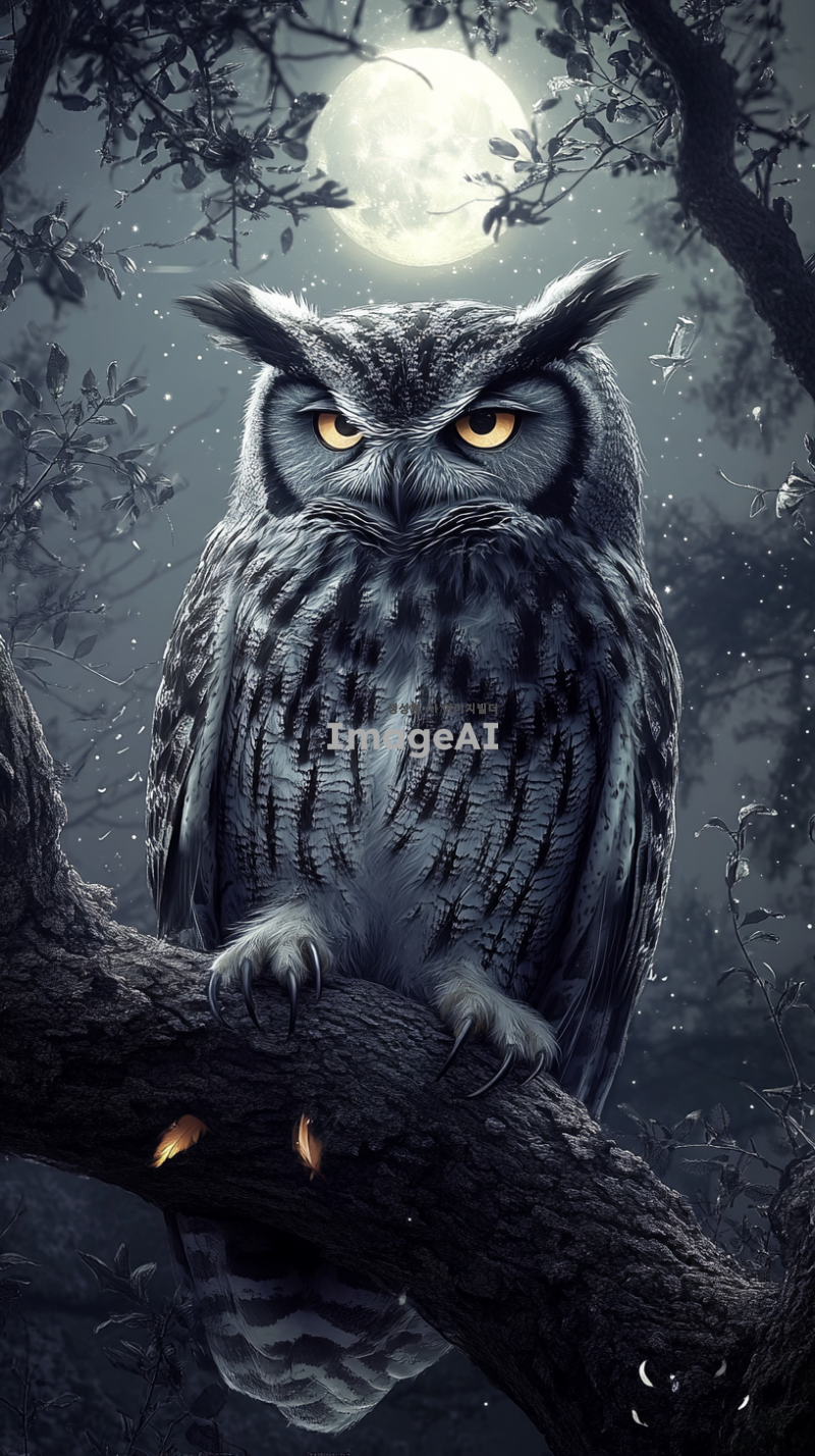 한국의 숲속에서 나무에 앉아 있는 부엉이, 부드러운 달빛 아래에서 깜빡이는 눈, 주변에는 나무와 풀들이 어우러져 있는 자연의 모습, 신비로운 분위기, 세밀한 디테일, 부엉이의 깃털 질감이 잘 드러나도록.