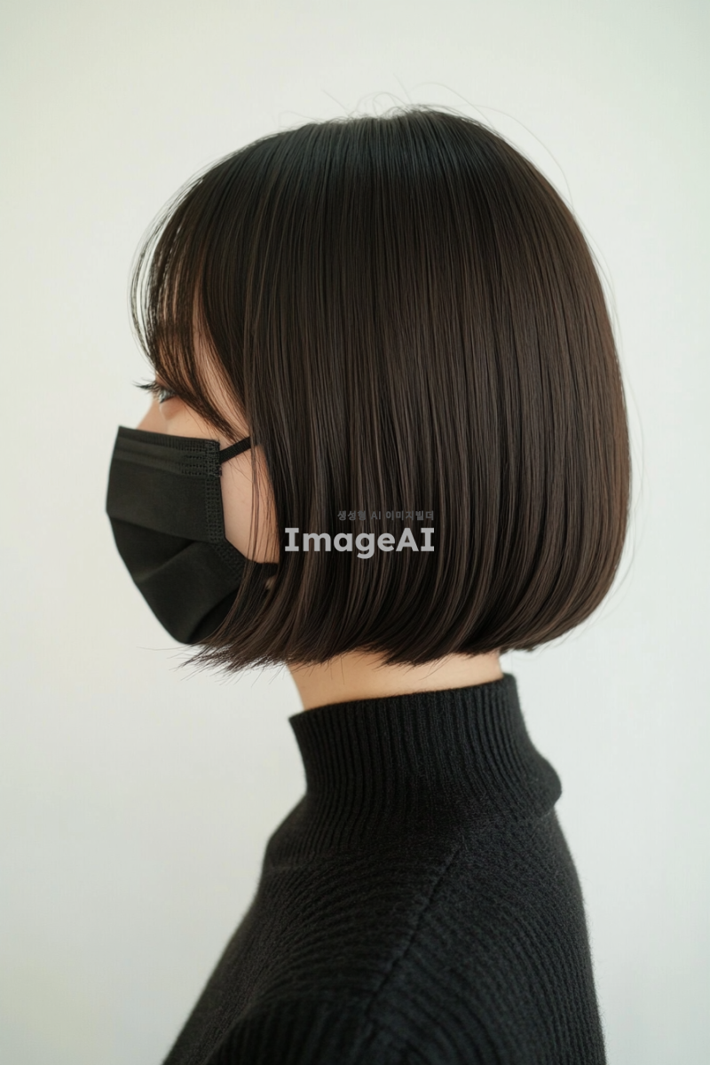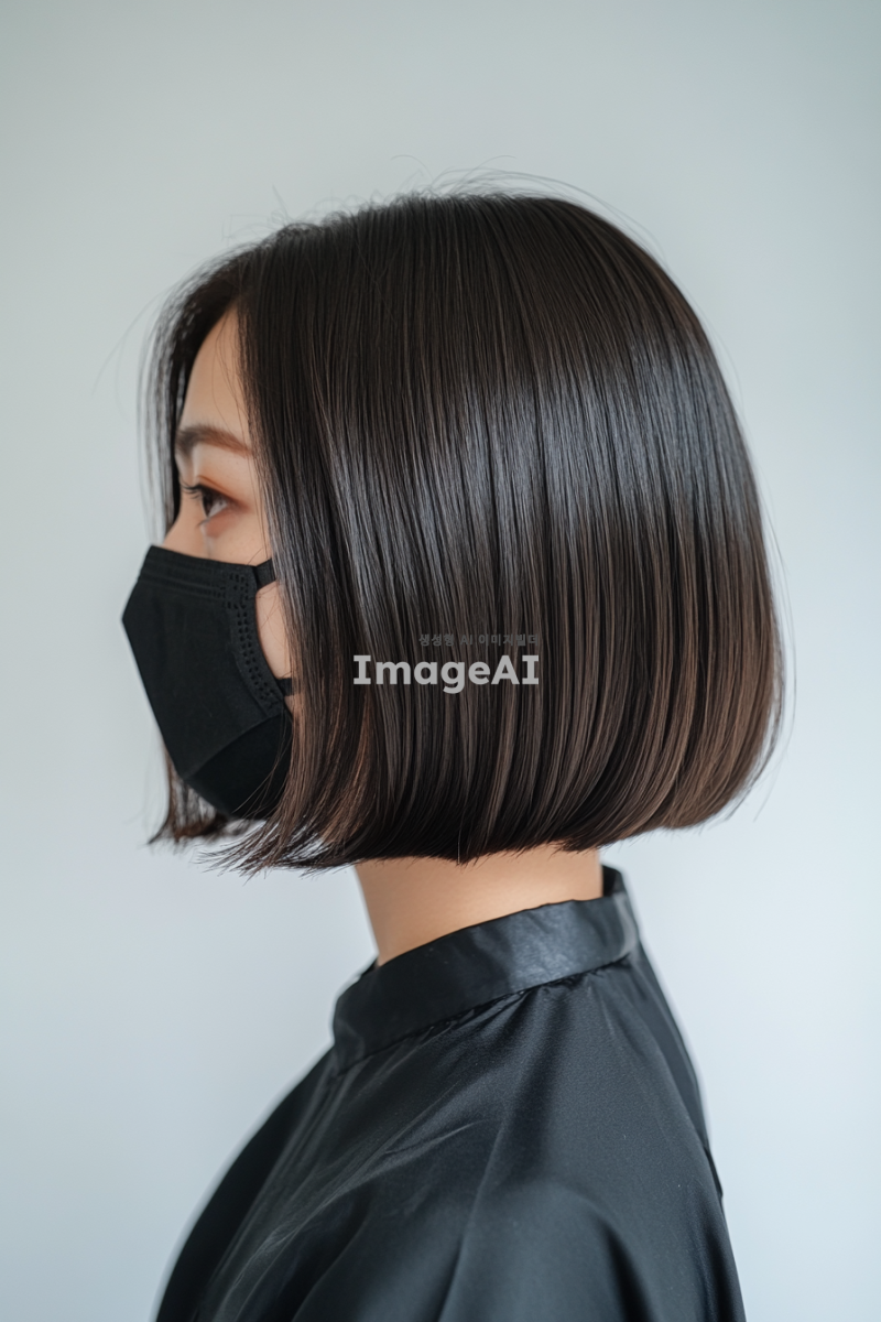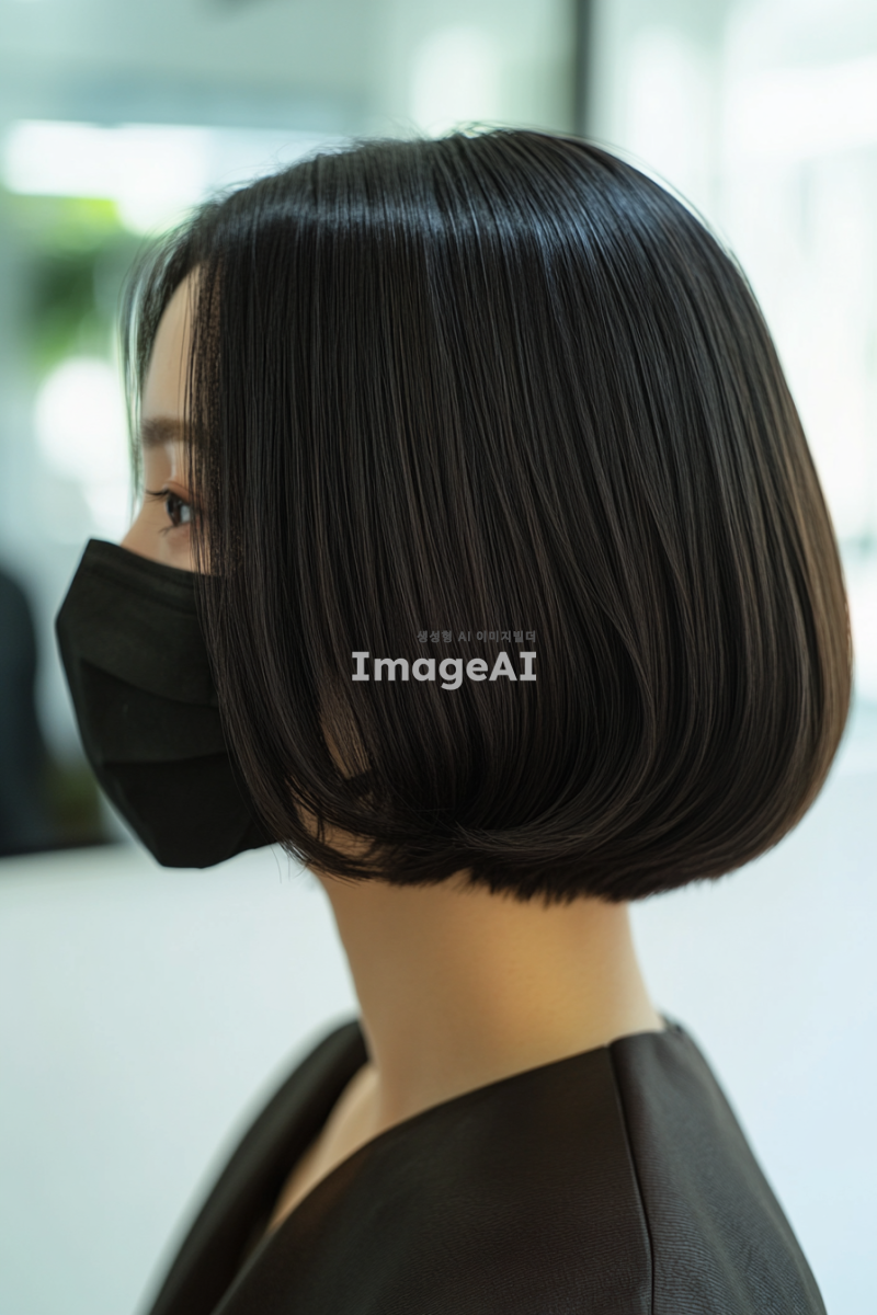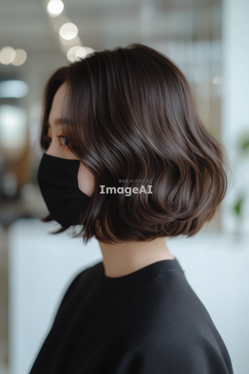 미용실 작업의 뒷모습 사진, 어깨 길이의 다크 브라운 일정한 모양의 웨이브 보브 헤어스타일을 가진 평범한 아시아 여성, 검은 마스크 착용, 흰색 배경과 자연광이 있는 사무실 환경. 일반 카메라로 찍은 일반화질의 사진