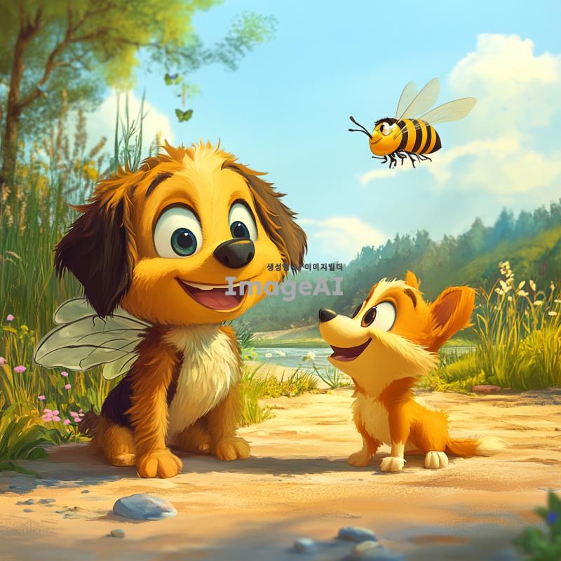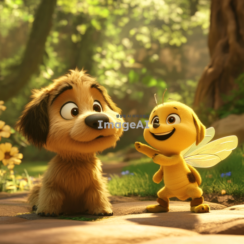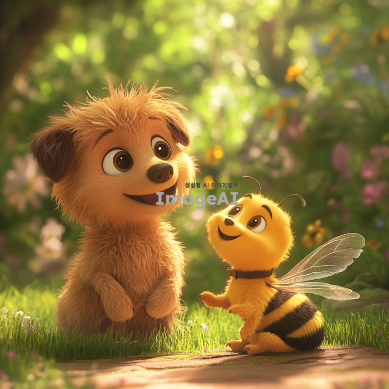 픽사 스타일의 애니메이션에서 벌과 강아지가 함께 노는 모습, 밝고 화사한 색감, 귀엽고 친근한 캐릭터 디자인, 자연 배경 속에서 행복하게 어울리는 장면, 강아지는 털이 부드럽고 귀여운 표정, 벌은 생동감 넘치는 날개와 미소를 지닌 모습, 전체적으로 따뜻하고 즐거운 분위기.