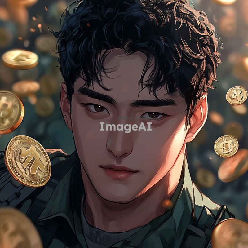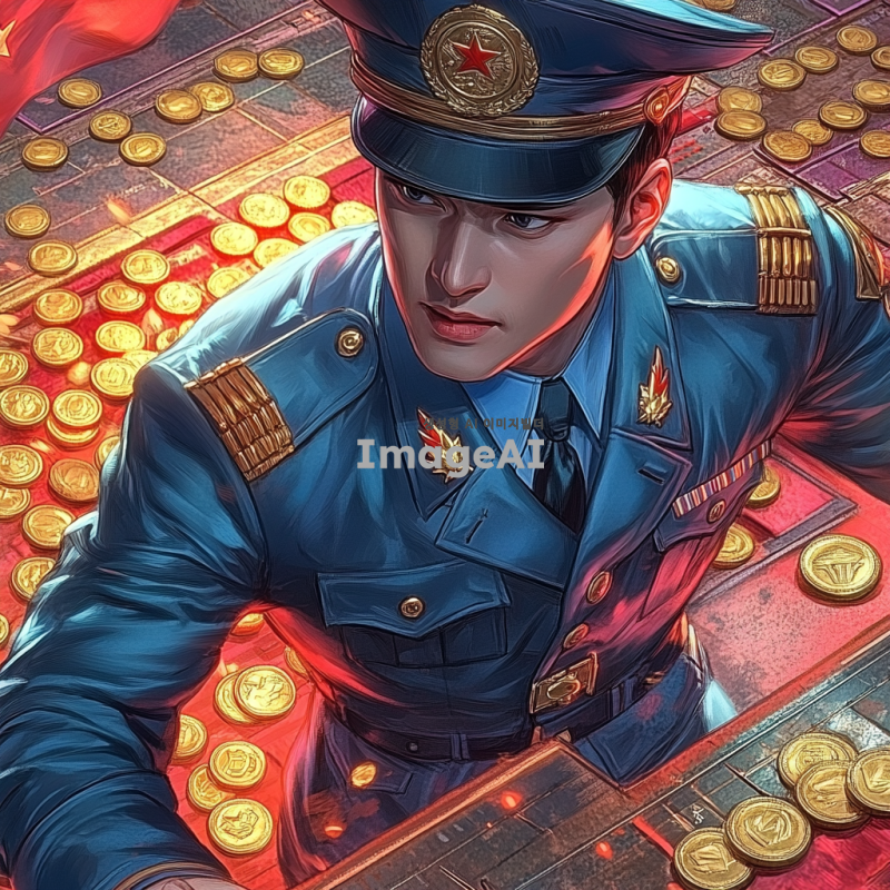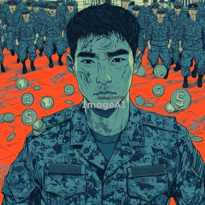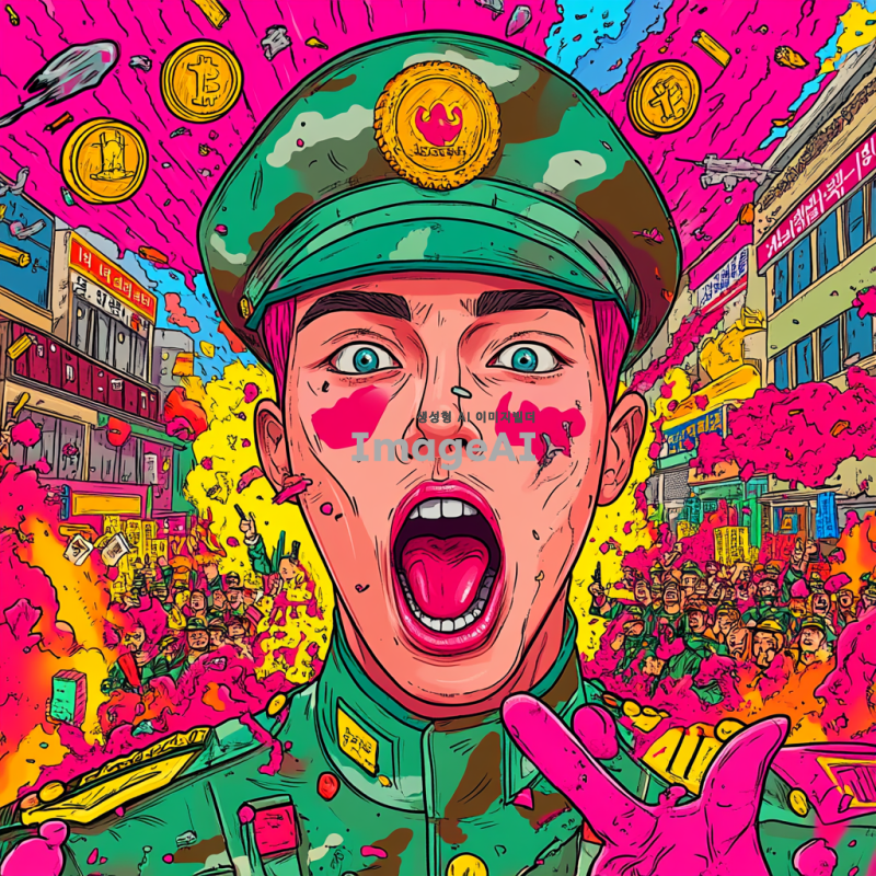 한국 군인이 군복을 입고, 밈 코인과 관련된 그래픽 요소들이 배경에 있는 장면. 군인은 강인한 표정으로 전투 자세를 취하고 있으며, 주변에는 코인 아이콘과 유머러스한 텍스트가 포함된 만화 스타일의 요소들이 흩어져 있다. 색감은 밝고 생동감 넘치며, 전체적인 분위기는 유머러스하면서도 군의 힘을 강조하는 느낌을 준다.