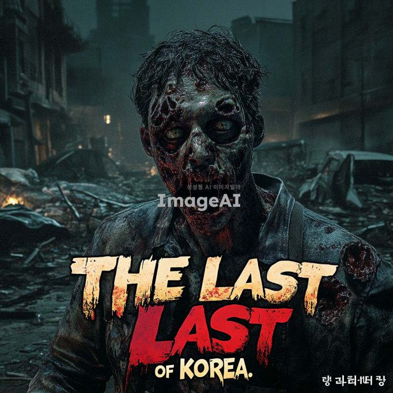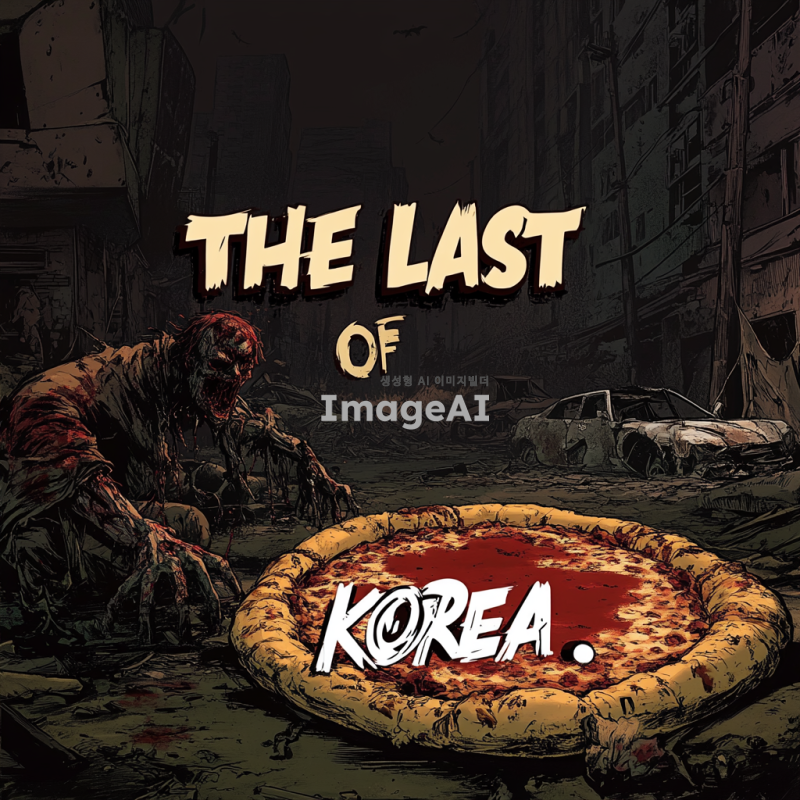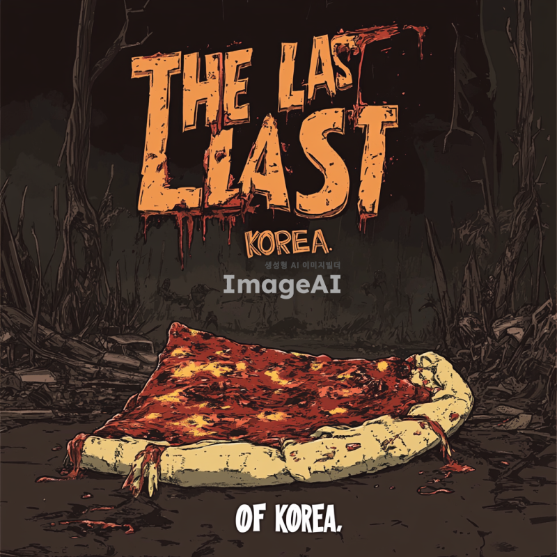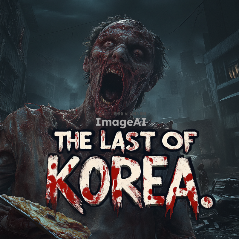 좀비 배경을 가진 이미지, 전경에는 "THE LAST"라는 글씨가 크고 두드러지게 표시되어 있으며, "OF" 부분에는 피자 자국이 있는 디자인, "KOREA"라는 글씨가 포함된 한국적인 요소가 강조된 장면. 배경은 어두운 분위기의 좀비 아포칼립스 설정으로, 폐허가 된 도시 풍경이나 음산한 숲이 어우러진 모습.