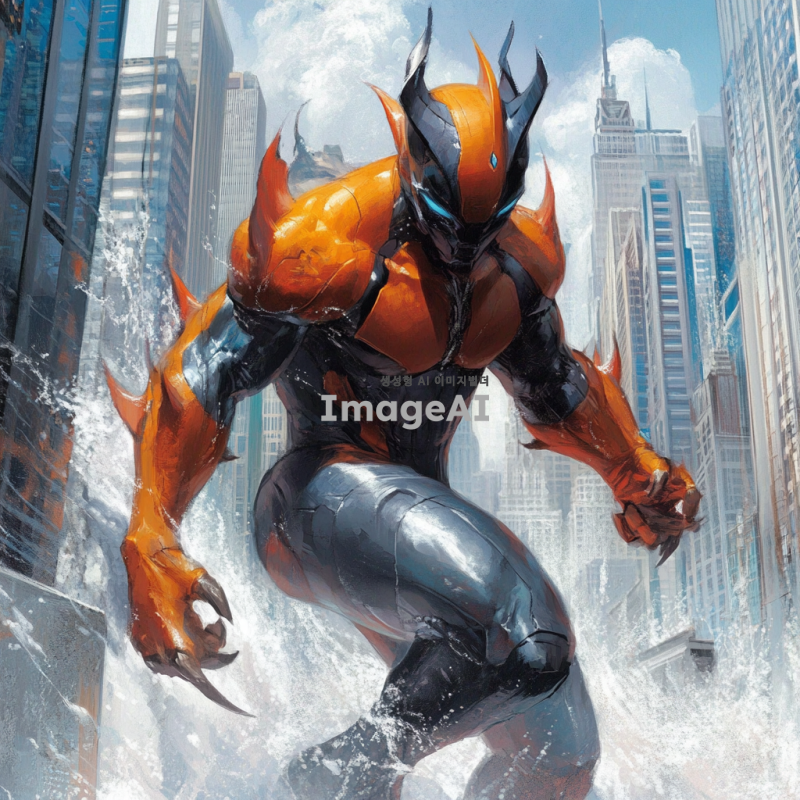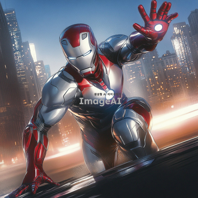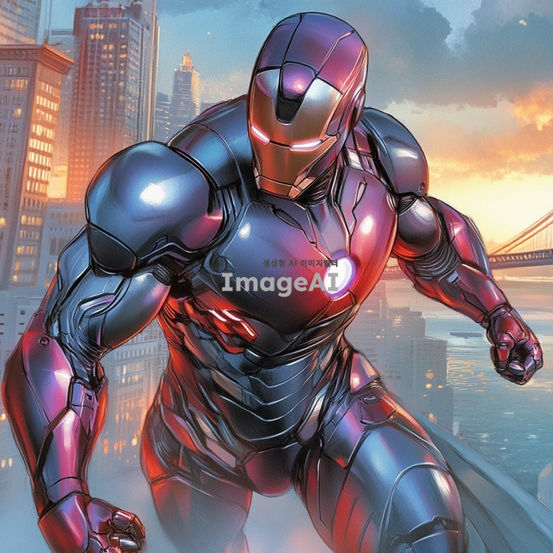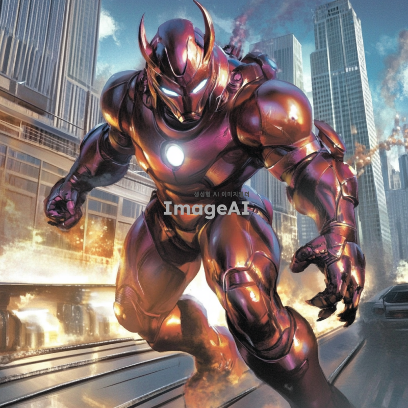 아이언맨인데 짐승같고 모습이지만 영웅으로 보이는 듯한 느낌으로 이미지 만들어줘