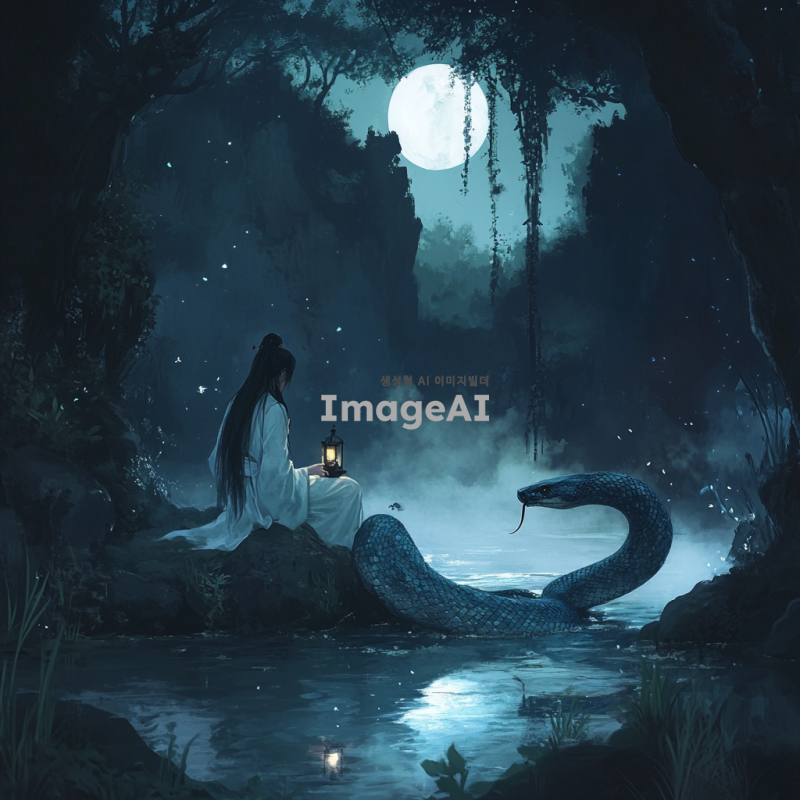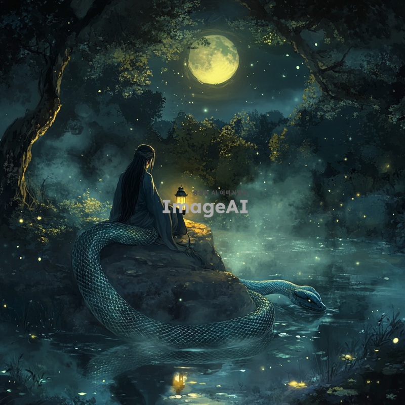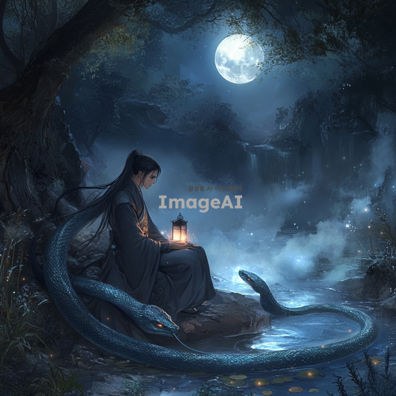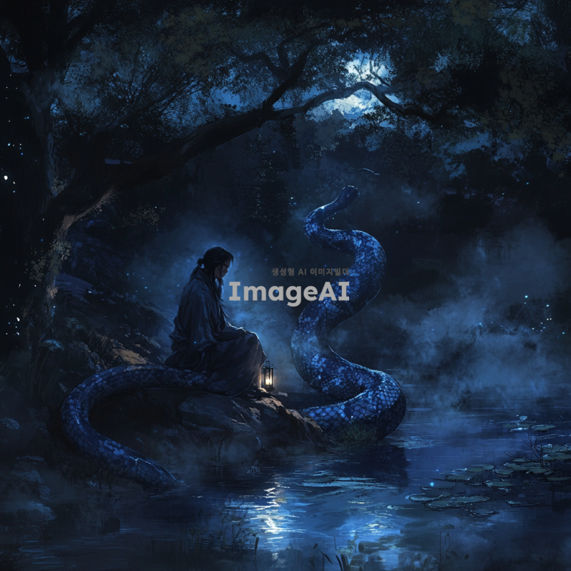 어두운 밤, 연못에 달빛이 비치고 물안개가 감도는 신비로운 풍경. 한가운데 바위 위에 두루마기를 입은 검은 머리의 신선이 청사초롱을 들고 앉아있고, 그 옆에는 파랗고 신비로운 큰 뱀이 신선을 감싸고 있는 모습. 주변은 어두운 숲으로 둘러싸여 있으며, 달빛이 물 위에 반짝이고 있다.