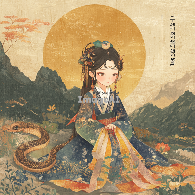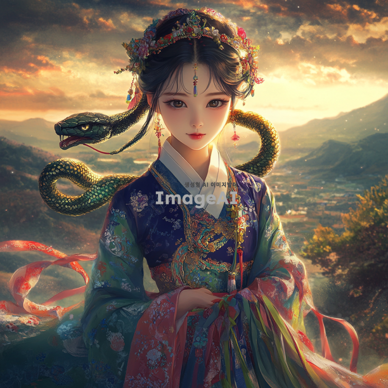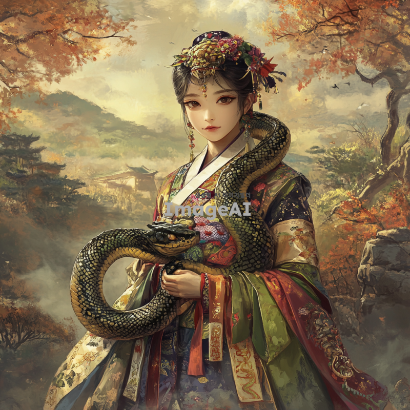 한국의 전통적인 뱀띠 캐릭터, 화려한 색상의 한복을 입고, 뱀의 상징과 관련된 장식이 가미된 모습, 배경은 한국의 자연 풍경으로, 부드러운 빛이 비치는 따뜻한 분위기, 뱀띠의 지혜와 신비를 표현하는 요소들 포함.