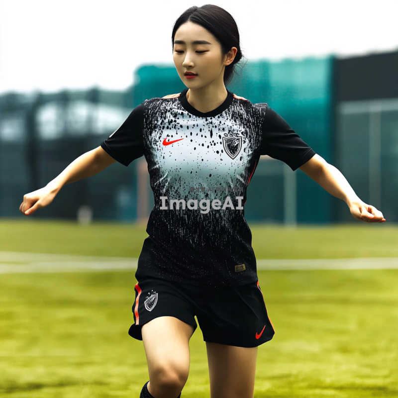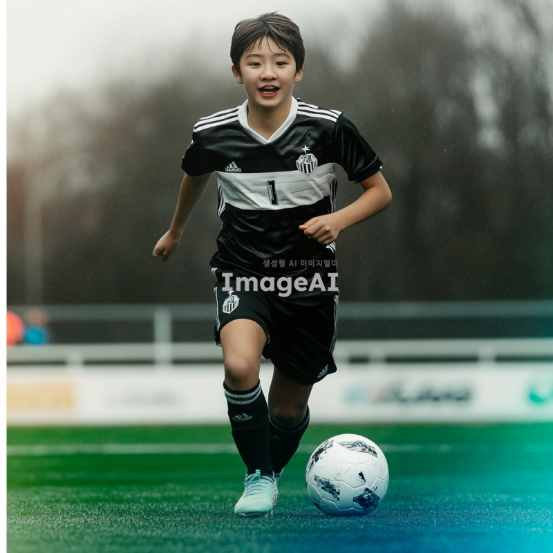 검정색을 주된 색상으로 하여 뉴캐슬 유니폼 스타일의 조기축구 유니폼 디자인, 밝고 생동감 있는 느낌을 주는 색상 조합, 세련된 패턴과 디테일, 한국인 모델이 입고 있는 모습, 축구 경기 중의 역동적인 포즈, 배경은 잔디 구장.