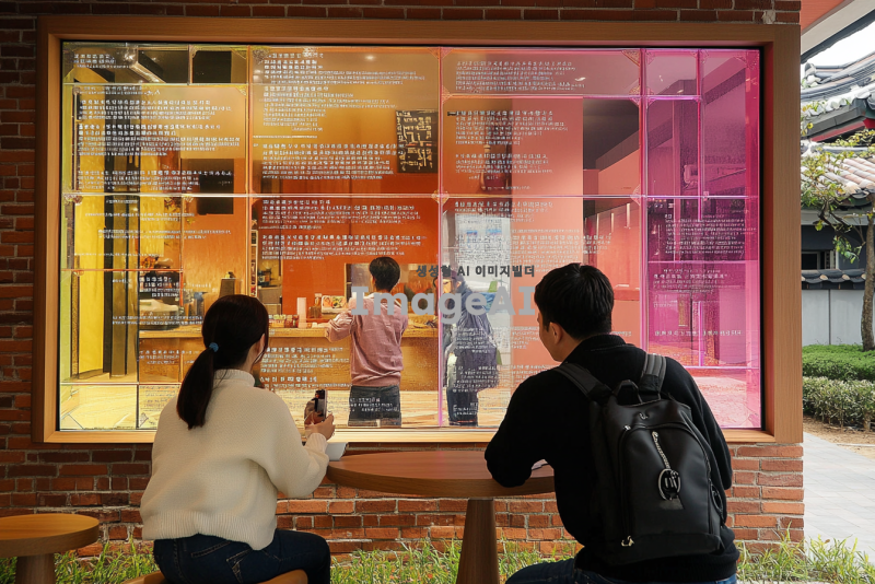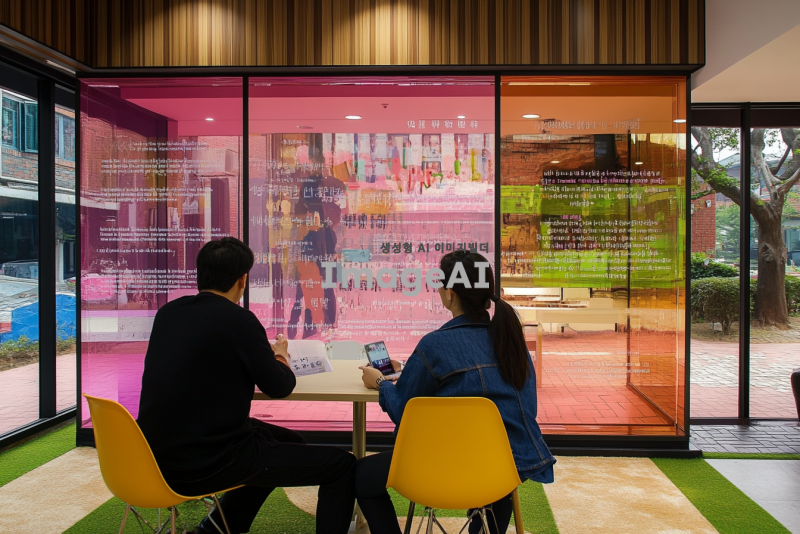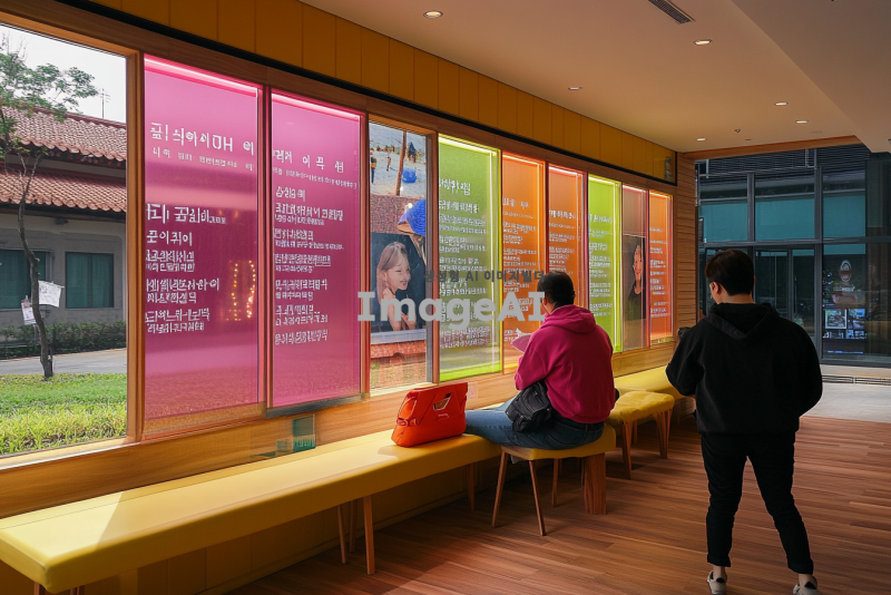 아크릴 메시지 월 디자인, 현대적이고 세련된 느낌의 인테리어, 다양한 색상의 아크릴 패널이 조화롭게 배열된 모습, 부드러운 조명 아래에서 반짝이는 효과, 감성적인 문구가 새겨진 아크릴 패널, 따뜻한 분위기의 카페나 사무실 공간, 한국인 남녀가 대화하는 장면, 아늑하고 편안한 느낌의 공간, 고급스러운 재질과 세련된 디자인 강조.