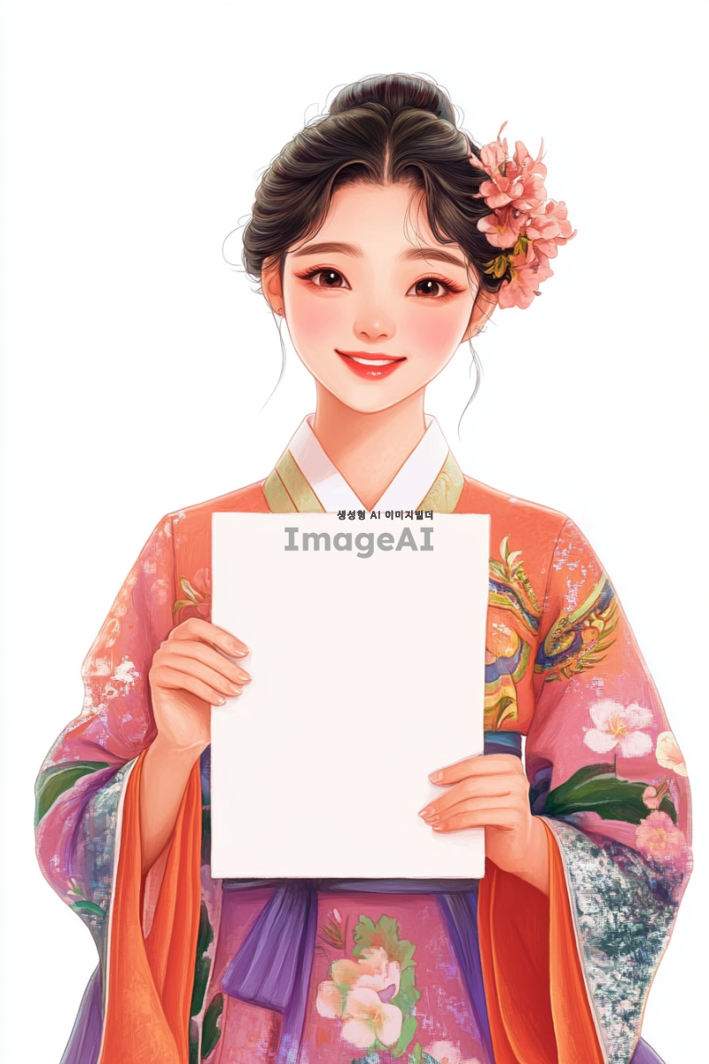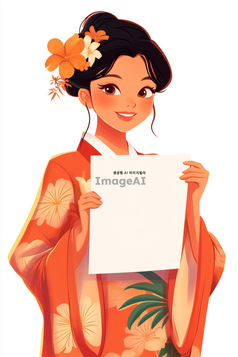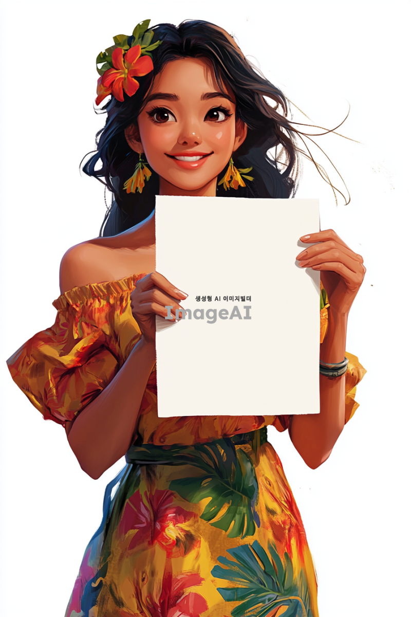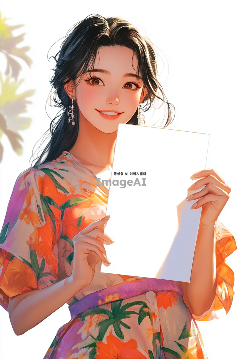 여성 캐릭터가 직사각형의 하얀 종이를 들고 있는 모습. 캐릭터는 한국인으로, 부드러운 표정과 함께 종이를 바라보며 미소 짓고 있다. 배경은 하얀색. 캐릭터의 의상은 하와이 느낌, 밝고 화사한 색감이 돋보인다. 종이에는 빈 공간이 있다. 종이의 크기는 지폐 사이즈이다