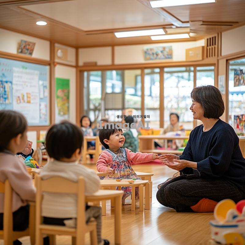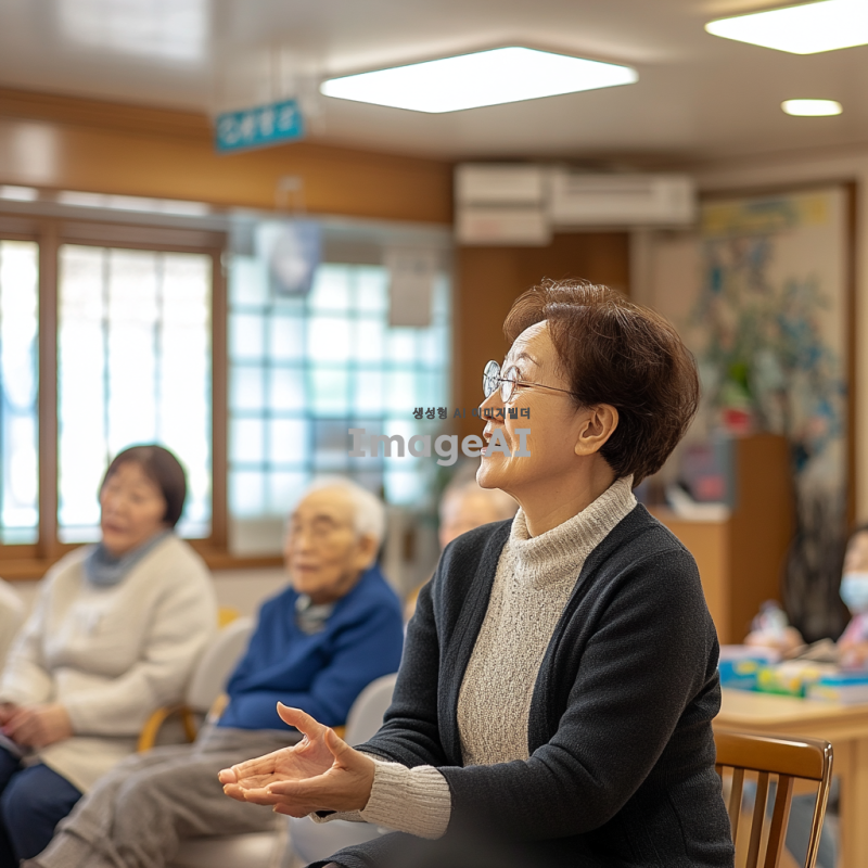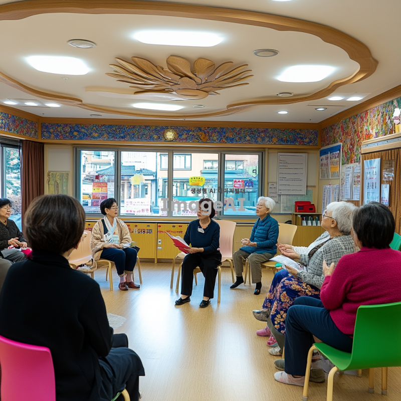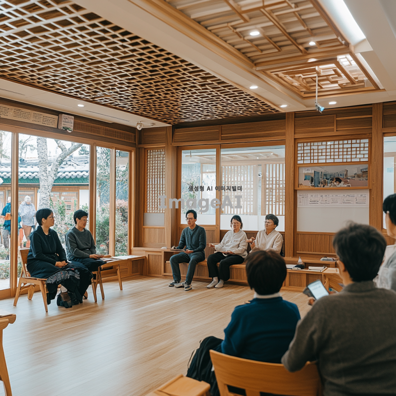 주간보호센터와 요양원에서 진행되는 맞춤형 프로그램 교육을 홍보하기 위한 심플한 사진. 따뜻한 분위기의 교육 현장, 한국의 전통적인 요소가 가미된 실내 공간에서 다양한 연령대의 사람들이 함께 참여하고 있는 모습. 강사가 친절하게 설명하고 있으며, 참가자들이 활발하게 질문하고 소통하는 장면. 밝고 긍정적인 느낌을 주는 색상과 조명으로 아늑한 분위기를 강조.