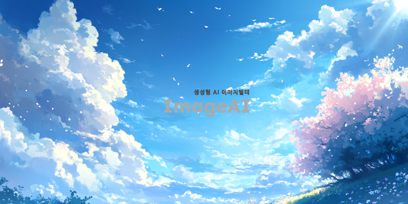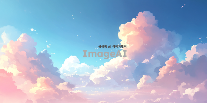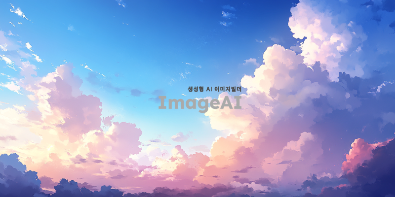 푸르고 맑은 하늘 위에 부드럽고 솜사탕 같은 하얀 구름들이 떠 있는 풍경, 햇살이 비추며 구름 사이로 빛이 스며드는 모습, 자연의 평화로운 분위기를 강조한 그림.