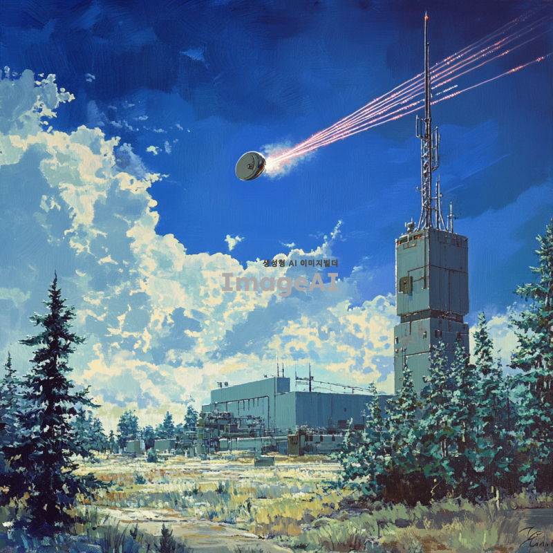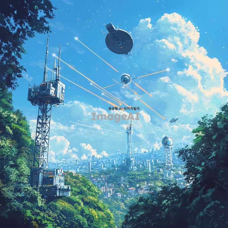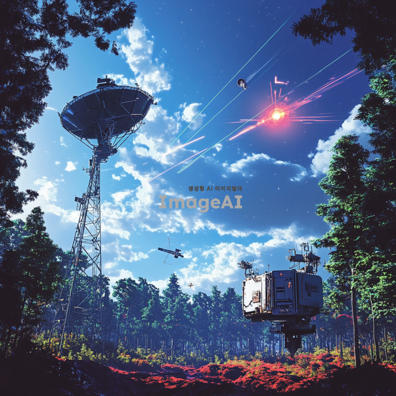위성이 하늘에 떠 있고, 지상에 위치한 레이더가 위성을 탐지하는 장면. 레이더의 송신기에서 나오는 신호가 위성을 향해 발사되고 있는 모습. 배경은 푸른 하늘과 구름으로 가득 차 있으며, 레이더 기지 주변에는 나무와 건물이 보인다. 위성은 현대적인 디자인으로, 레이더는 기술적인 디테일이 강조된 모습. 전체적으로 미래지향적이고 과학적인 분위기를 강조.