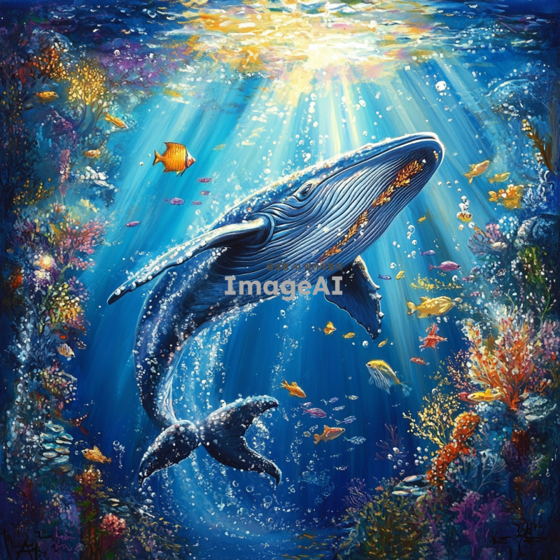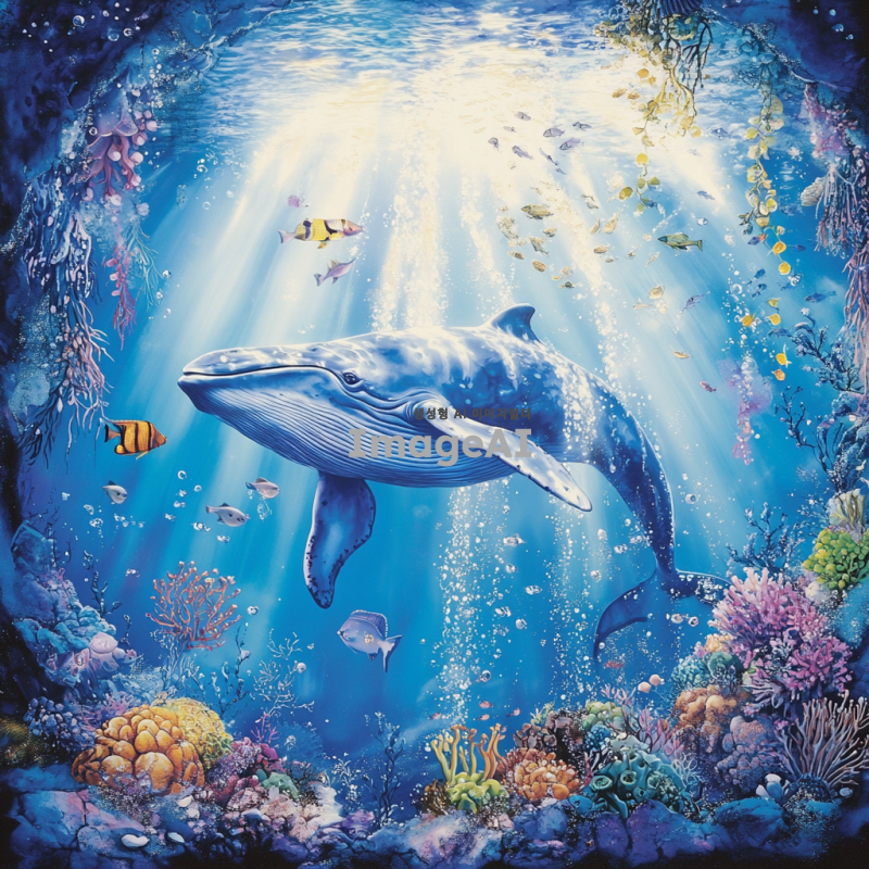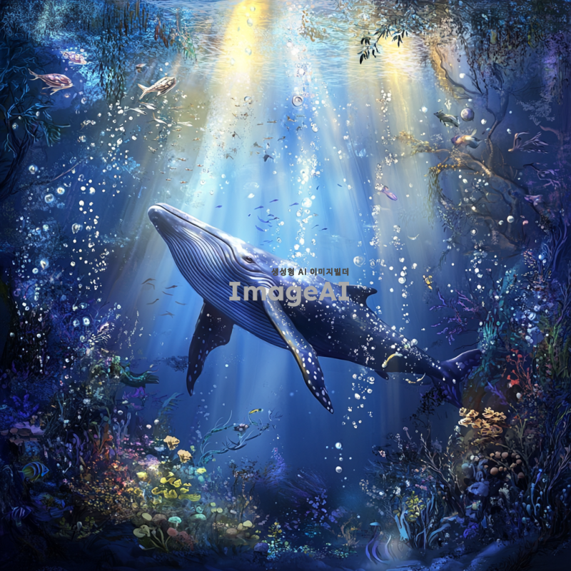 푸른 바다 속에서 유영하는 고래, 햇빛이 물속으로 비치며 고래의 아름다운 비늘이 반짝이는 모습, 주변에는 다양한 해양 생물들이 함께 있는 장면, 평화롭고 신비로운 분위기, 자연의 아름다움을 강조한 이미지.