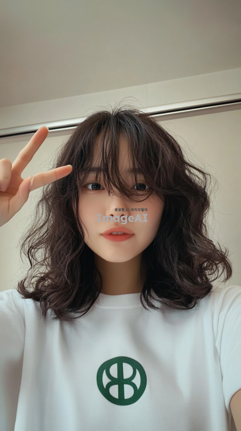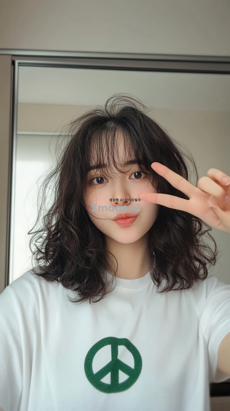 아시아 소녀가 자신의 핸드폰으로 셀카를 찍고 있는 사진으로, 흰색 티셔츠를 입고 카메라에 평화의 제스처를 보이고 있습니다. 그녀는 거울 앞에 서 있습니다. 머리는 웨이브 뱅 스타일로 어깨 길이의 어두운 갈색 곱슬머리입니다. 배경은 없고, 그녀 뒤에는 평평한 벽만 있습니다. 집 내부처럼 보입니다. 조명이 그녀의 얼굴 주위에 부드러운 그림자를 만듭니다. 스마트폰 카메라로 촬영되었습니다.