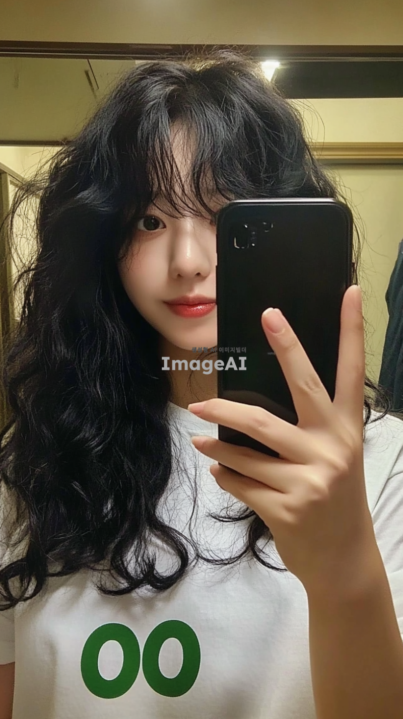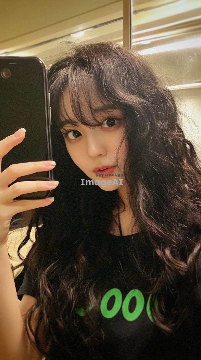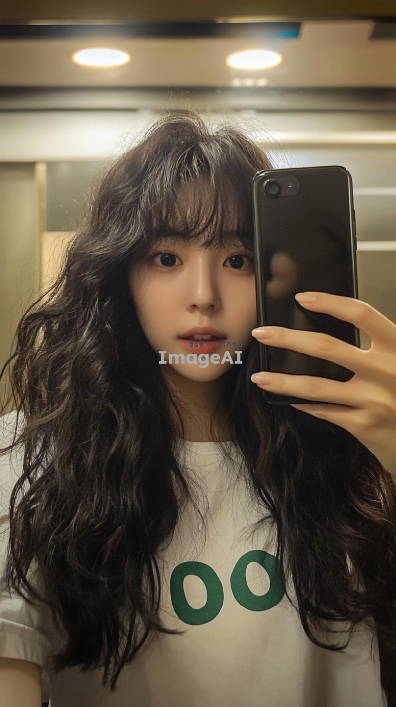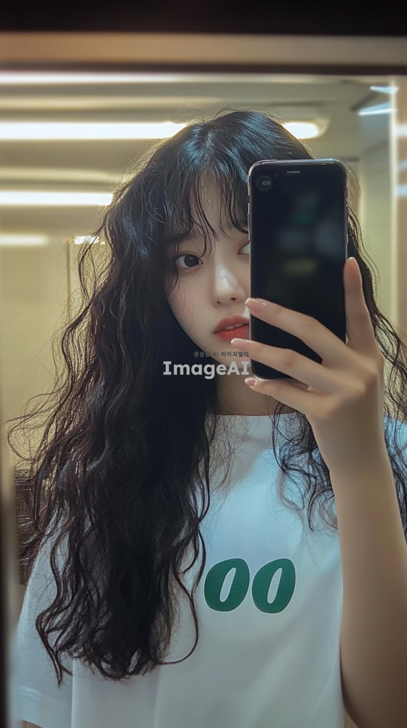 평범한 한국 소녀가 자신의 핸드폰으로 셀카를 찍고 있는 사진으로, 티셔츠에는 초록색 글자 "OO"가 적혀 있습니다. 그녀는 거울 앞에 서 있습니다. 머리는 가슴기장정도 긴머리 곱슬머리 웨이브 뱅 스타일로 어깨 길이의 어두운 갈색 곱슬머리입니다. 배경은 집 내부처럼 보입니다. 조명이 그녀의 얼굴 주위에 부드러운 그림자를 만듭니다. 아이폰 6 카메라로 촬영되었습니다.