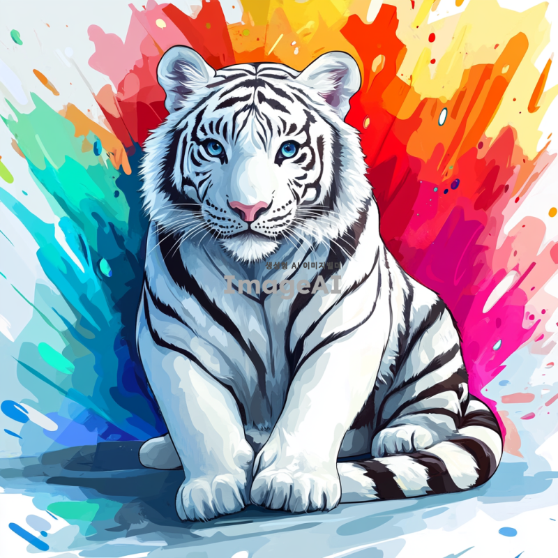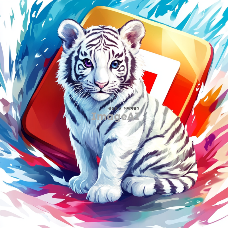 흰색 귀여운 호랑이가 유튜브 로고 위에 앉아 있는 모습, 호랑이는 사랑스럽고 친근한 표정을 짓고 있으며, 배경은 밝고 경쾌한 느낌을 주는 색상으로 구성되어 있음. 로고는 선명하고 깔끔하게 표현되어 있으며, 호랑이의 털은 부드럽고 윤기 나는 질감으로 묘사됨.