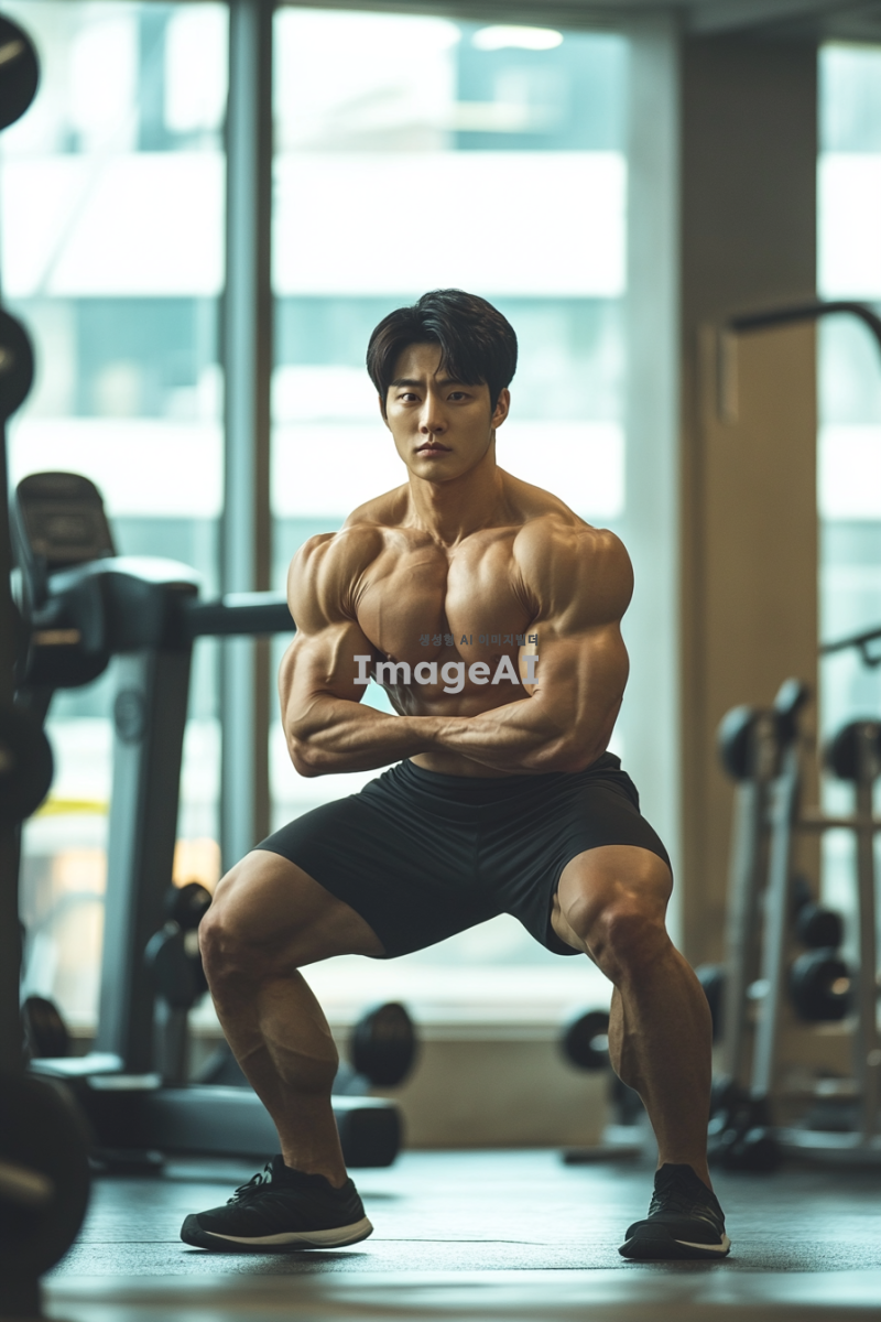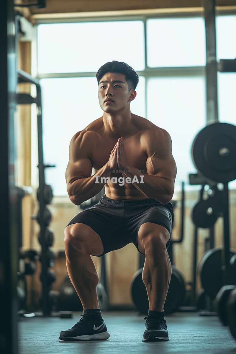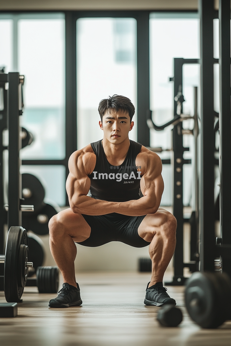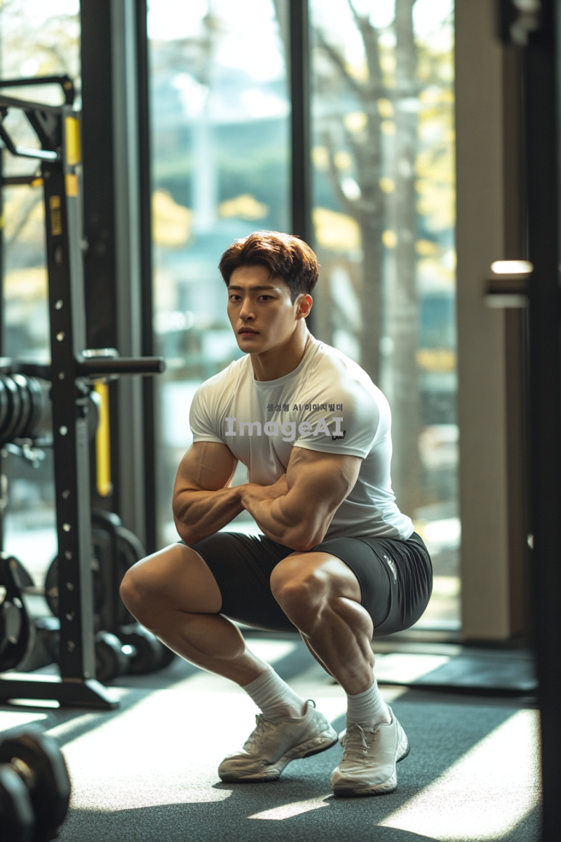 한국인 남성이 체육관에서 스쿼트를 하는 모습, 강한 체격과 집중한 표정, 근육이 강조된 하체, 배경에는 다양한 운동 기구가 있는 체육관 내부, 자연광이 들어오는 창문, 운동복을 입고 있는 모습, 역동적인 자세로 스쿼트를 하는 순간을 포착한 이미지.
