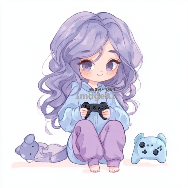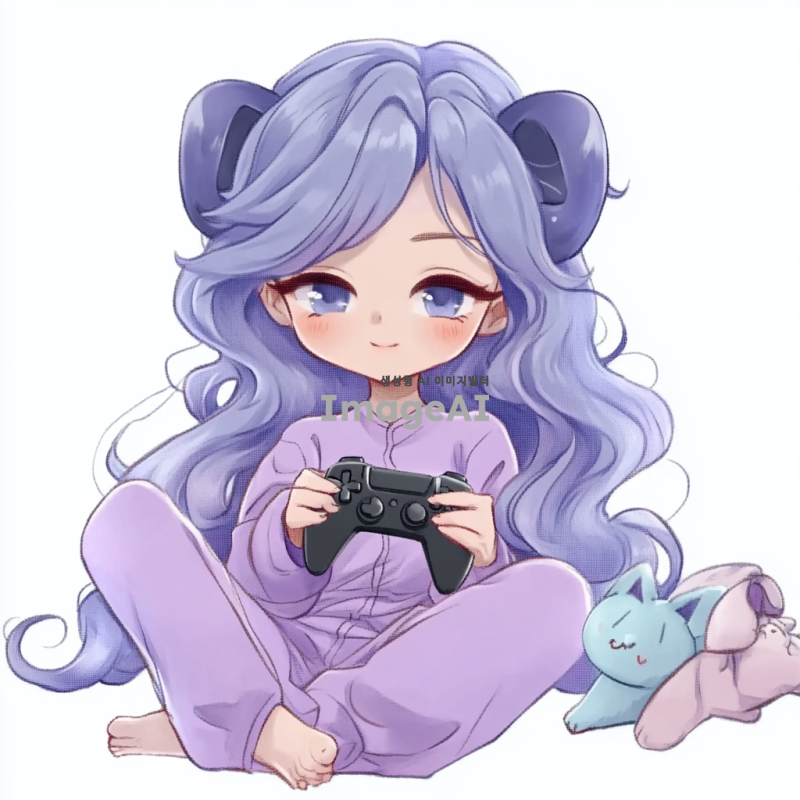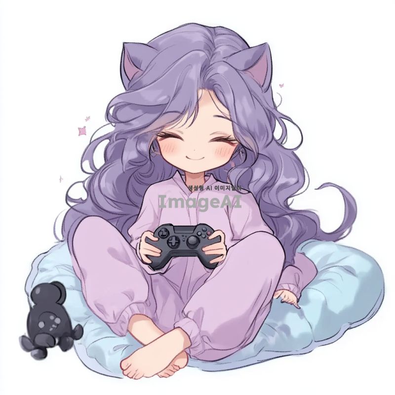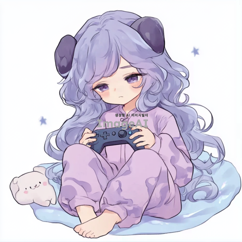 보라색 색상의 웨이브 긴 머리의 2D 캐릭터가 보라색 잠옷을 입고 게임패드를 들고 있는 모습. 배경은 없었으면 좋겠고 하얀 바탕이야