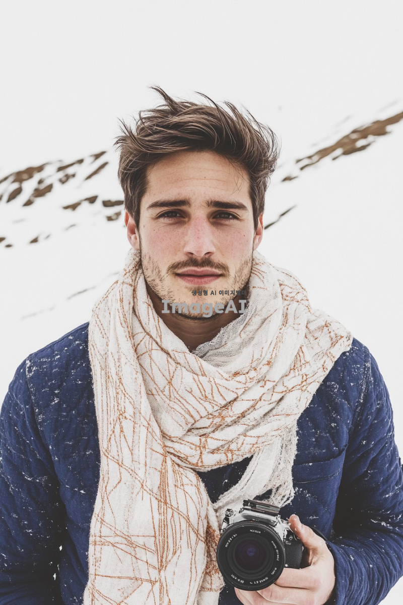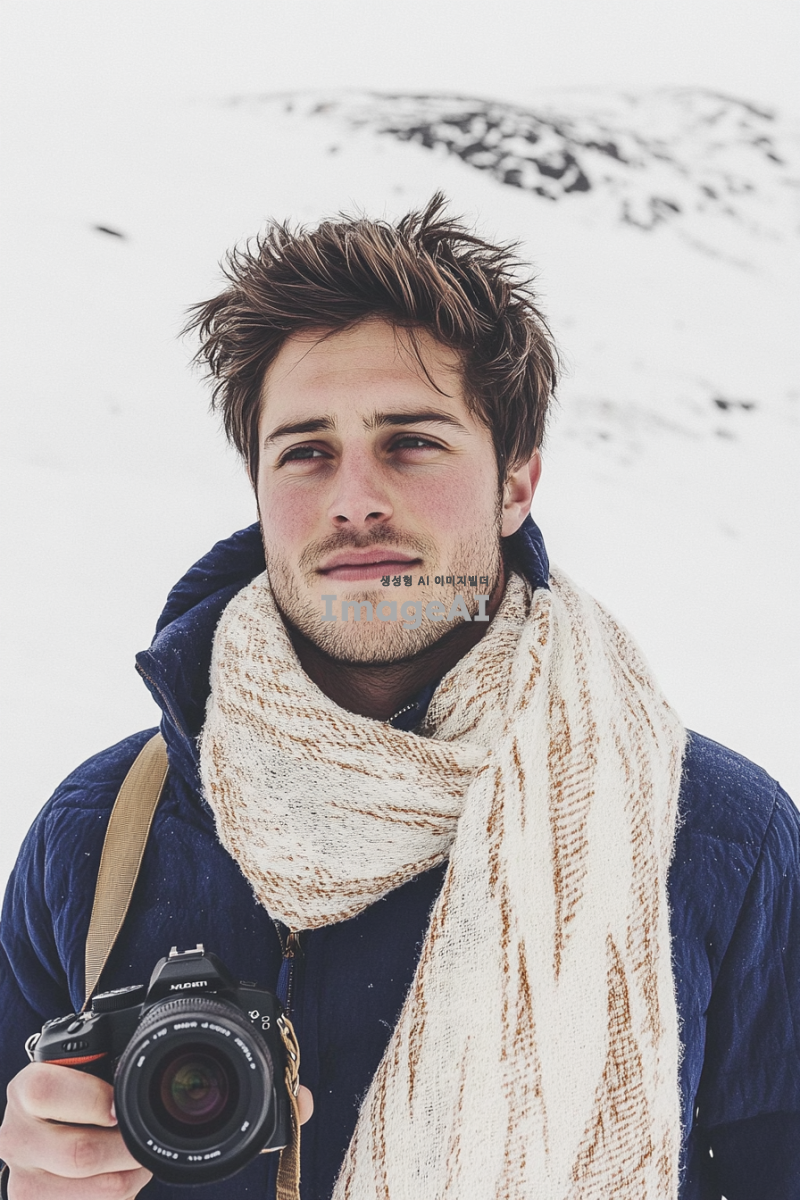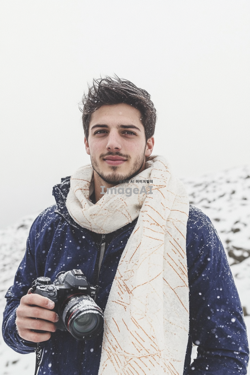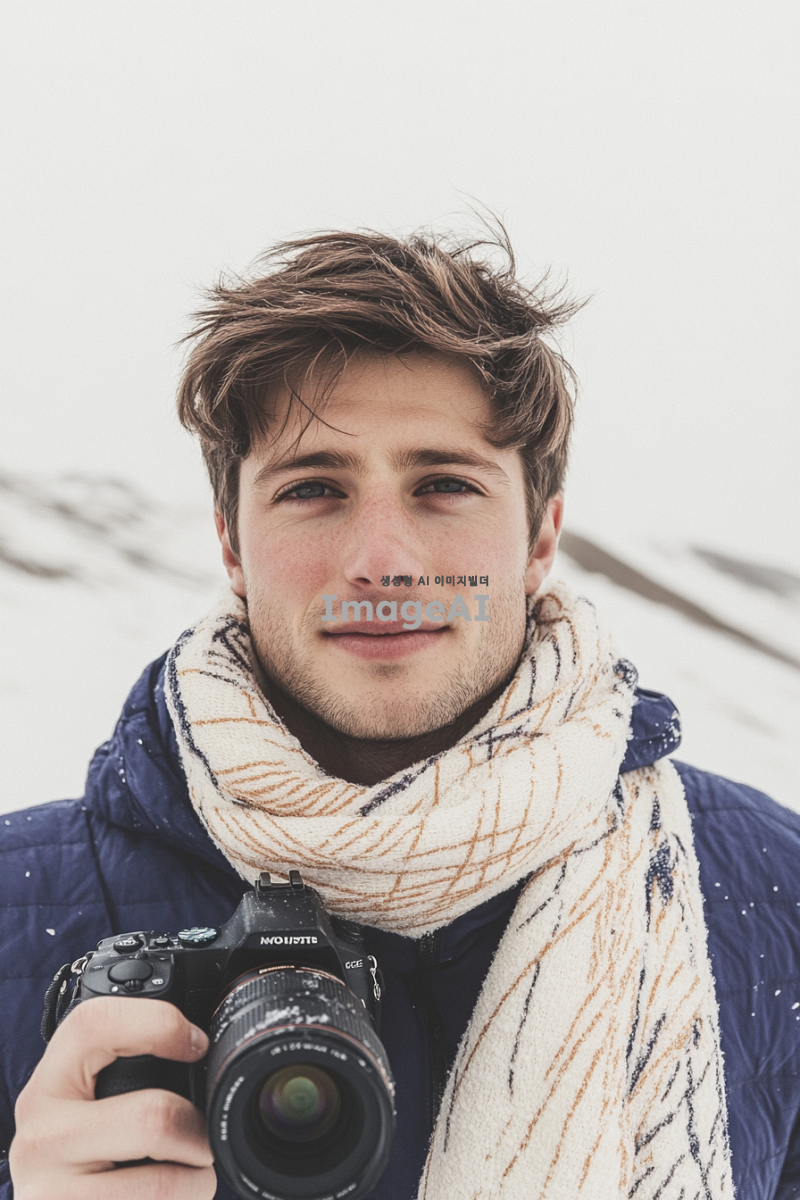 20대 초반 남성이 정면을 바라보며 손에 카메라를 들고 있는 모습. 남색의 짧은 머리를 하고 있으며, 푸른 자켓과 하얀 목도리를 두르고 있음. 추운 날씨로 입김이 나오는 모습이 보이며, 눈이 내리는 하얀 산 속 한가운데에서 미소를 지으며 서 있는 장면.