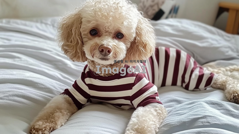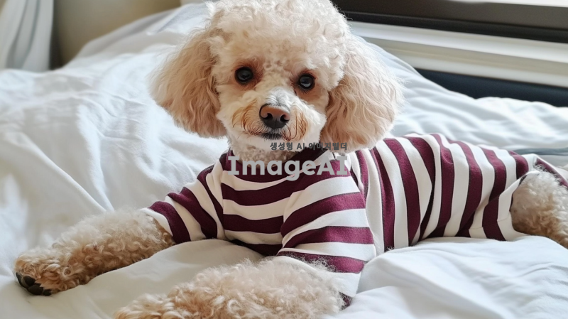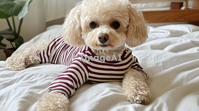 귀여운 크림색 푸들이 흰색과 마룬색 줄무늬 긴팔 티셔츠를 입고 침대에 앞발을 늘어뜨리고 누워 있으며, 캐주얼 스타일의 인스타그램 포스트를 위해 사진을 찍고 있습니다.