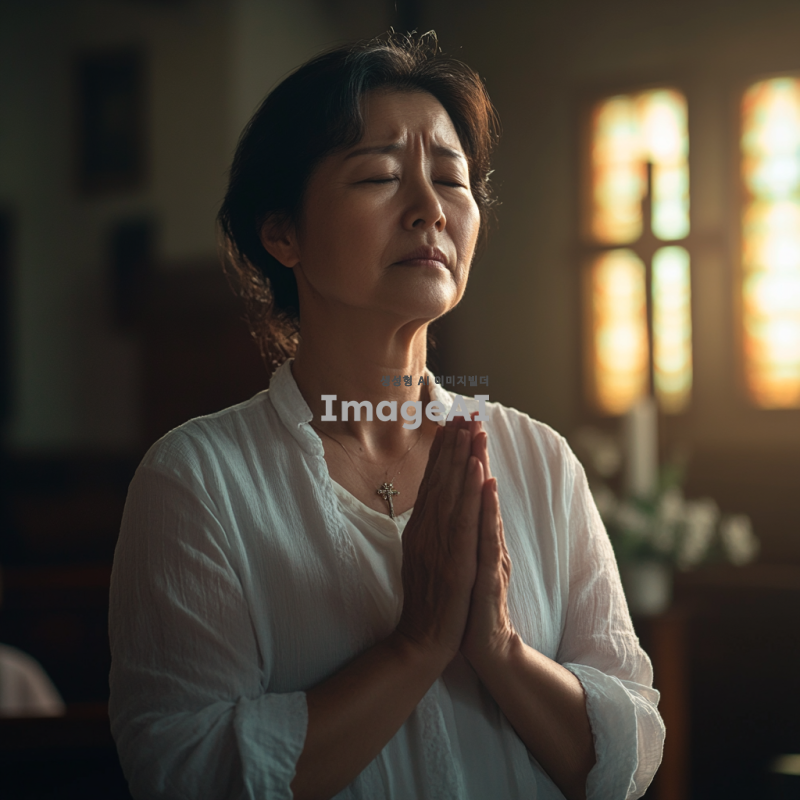 기도하는 한국 중년 여성의 모습, 조용한 교회에서 두 손을 모으고 깊은 기도를 드리는 모습, 부드러운 햇살이 비추는 장면, 평화롭고 경건한 분위기,여성뒤로십자가가보인다