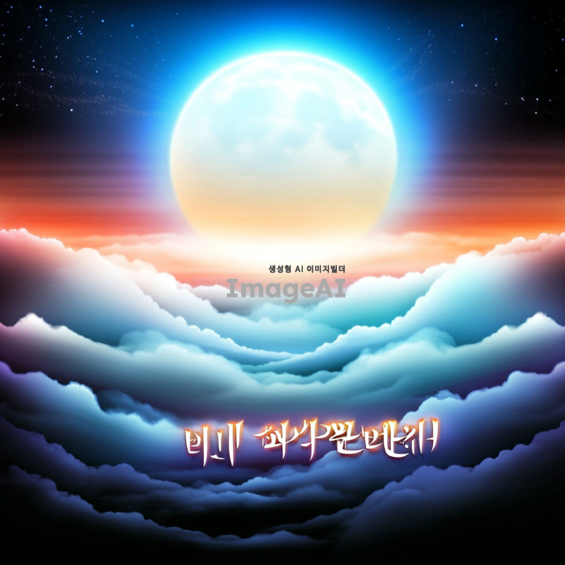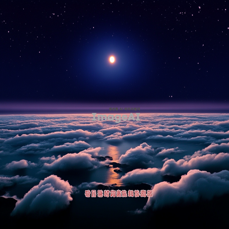 구름 위에 부드러운 달빛이 비치는 무대 배경, 몽환적인 분위기, 은은한 빛과 그림자가 어우러진 풍경, 하늘은 깊은 파란색과 보랏빛으로 물들어 있으며, 구름은 부풀어 오르고 부드러운 질감으로 표현됨, 신비로운 느낌을 주는 요소들 추가