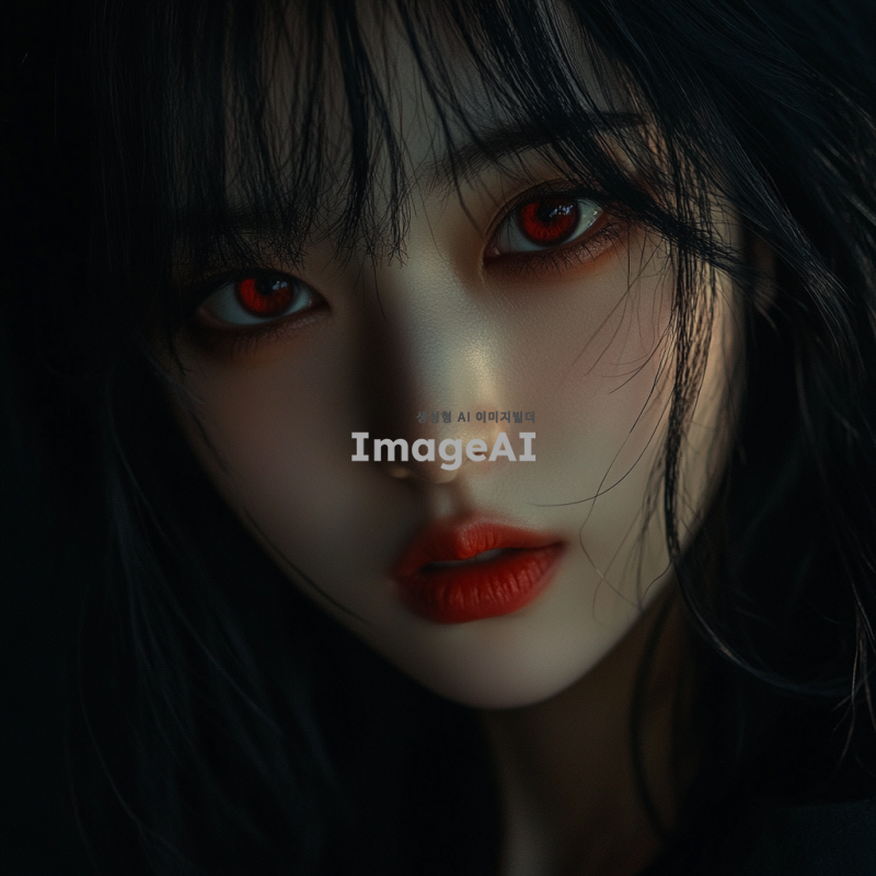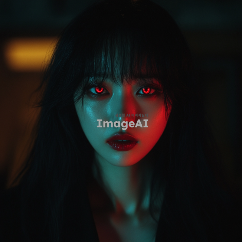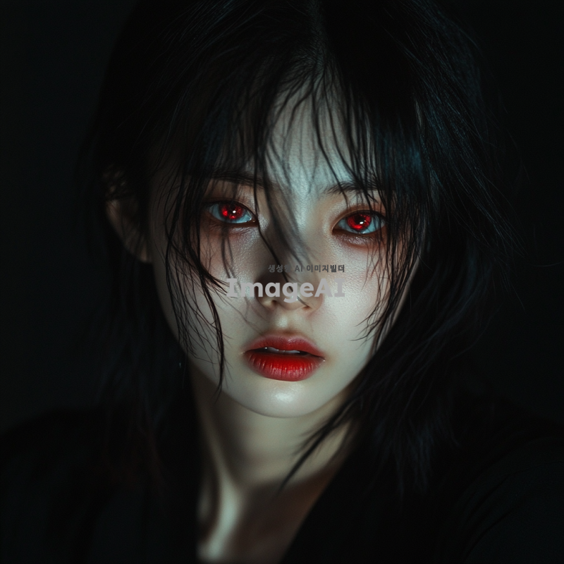 검은 머리카락을 가진 한국 여성, 빨간 눈을 가진, 짝사랑으로 인해 사기결혼한 나쁜 여자. 그녀는 교활한 미소를 지으며, 어두운 배경 속에서 음모를 꾸미고 있는 모습. 그녀의 표정은 매혹적이지만, 한편으로는 위험한 느낌을 주며, 주변에는 불길한 분위기가 감도는 장면.