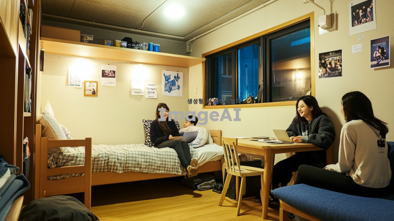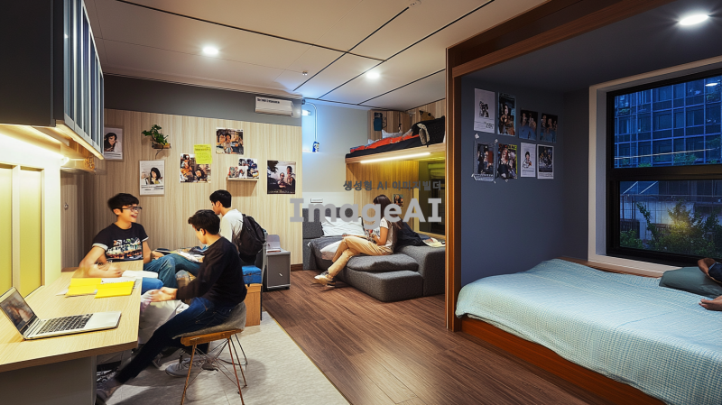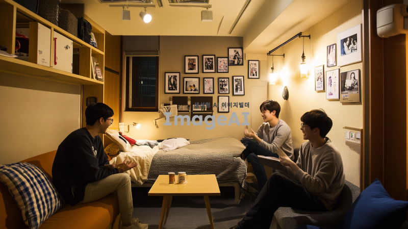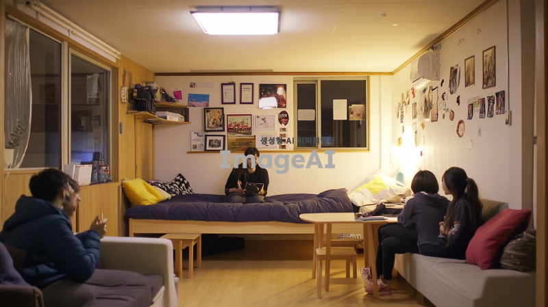 내무반의 편안한 분위기를 담은 실내 모습, 한국 전통 소품과 현대적인 가구가 조화를 이루는 공간, 따뜻한 조명이 비추는 아늑한 침대와 책상이 있는 모습, 벽에는 친구들의 사진과 추억이 담긴 액자가 걸려 있는 장면, 편안한 소파에 앉아 있는 사람들, 서로 대화하며 웃고 있는 모습, 전체적으로 친근하고 따뜻한 느낌의 실내 환경.
