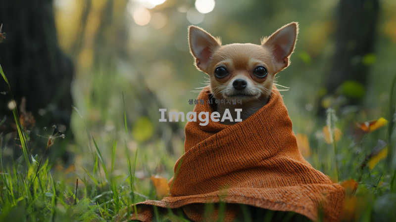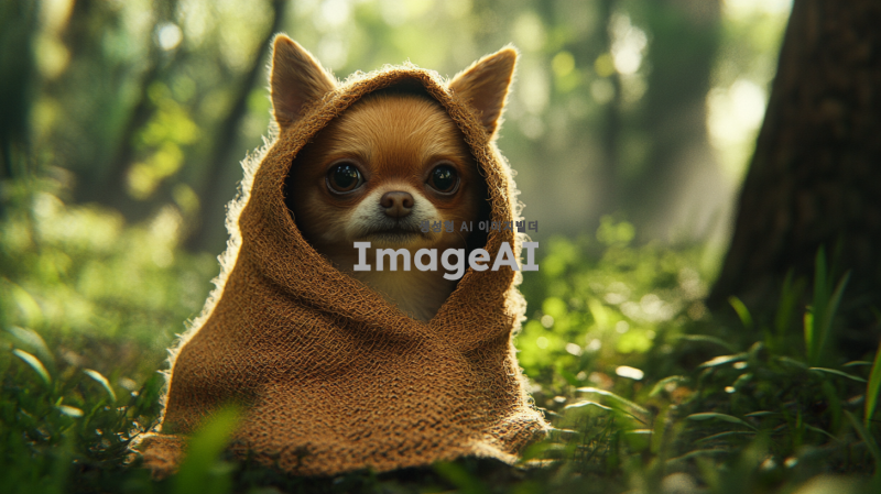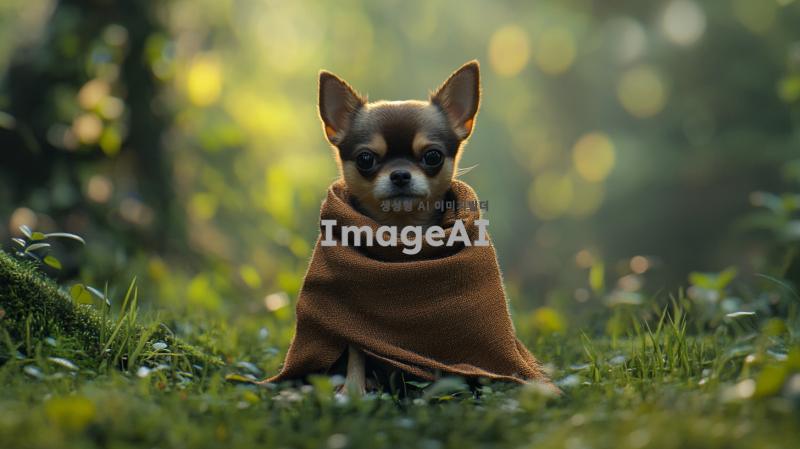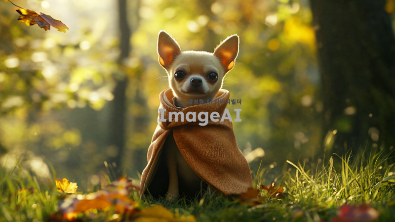 숲속에서 망토를 두른 작은 치와와, 3D 렌더링, 자연광이 비추는 푸르른 숲 배경, 아기자기한 나무와 풀, 귀여운 표정의 치와와, 망토의 색상은 따뜻한 톤, 생동감 있는 디테일, 부드러운 질감의 털, 조화로운 색감, 환상적인 분위기