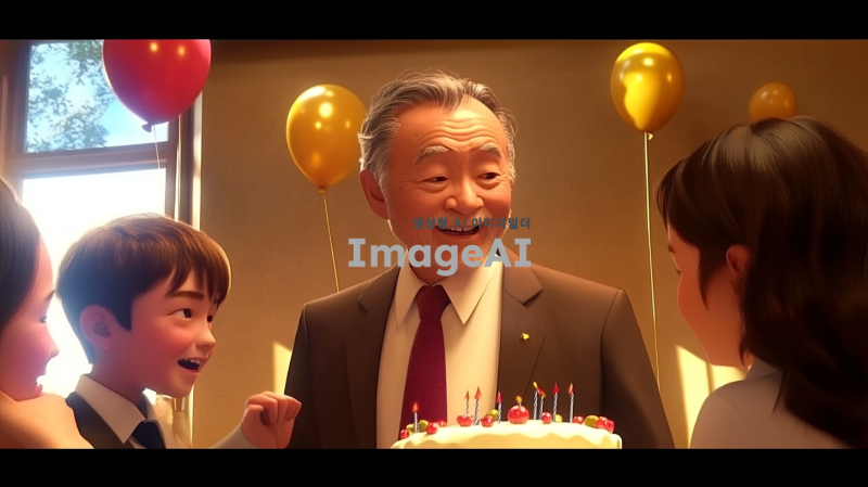 할아버지의 생신을 축하하는 분위기 속에서 가족이 함께 모여 즐거운 시간을 보내는 장면. 할아버지의 생신 케이크 앞에서 손주들이 퀴즈를 내고 있는 모습, 할아버지는 미소를 지으며 퀴즈를 듣고 있고, 주변에는 풍선과 장식이 어우러져 있는 따뜻하고 행복한 분위기. 가족들이 서로 웃으며 이야기를 나누고 있는 모습.
