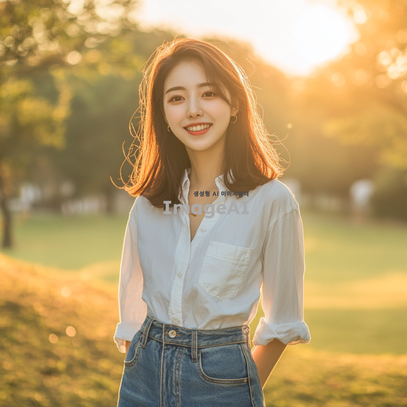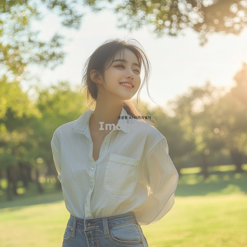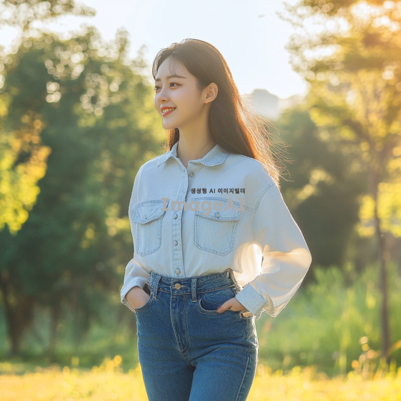 청바지를 입고 있는 한국인 여성, 자연스러운 포즈로 서 있는 모습, 밝은 햇살 아래에서 미소를 짓고 있는 모습, 배경은 화창한 공원, 편안하고 캐주얼한 스타일, 청바지의 디테일이 잘 보이도록, 청량한 분위기.