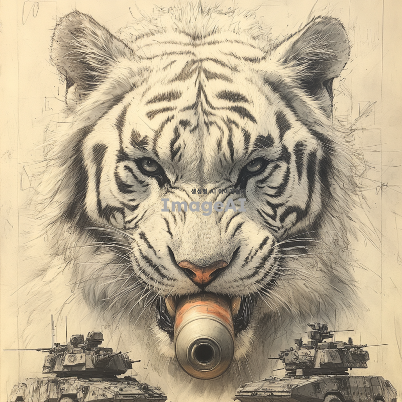 백호가 포탄을 물고 있는 장면을 그립니다. 포탄는 자연스럽게 보이도록 꽤 크고 무겁게 그려져야 합니다. 백호가 포탄을 입에 물고 있는 모습은 강한 인상을 남깁니다.