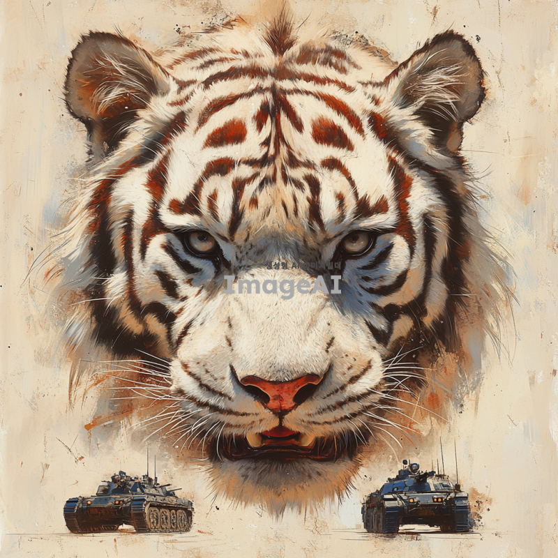백호의 아래쪽에는 K-9 전투 차량이 좌우에 배치됩니다. K-9은 사실적인 모습으로 약간 낮게 배치되며, 포탑은 백호를 향해 있습니다.