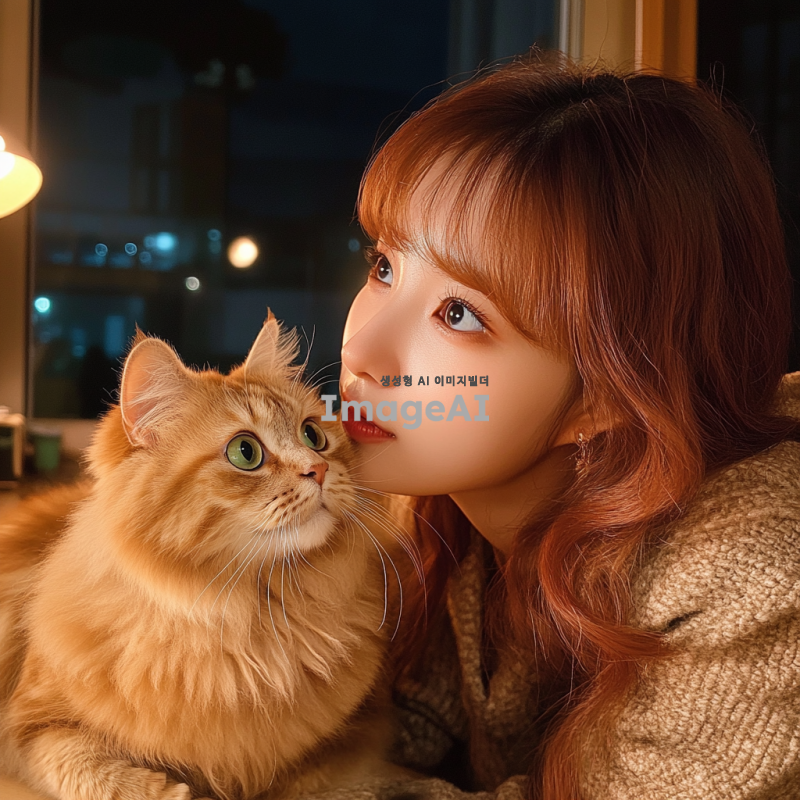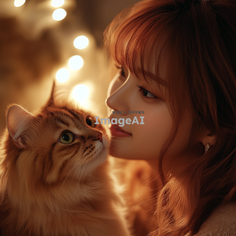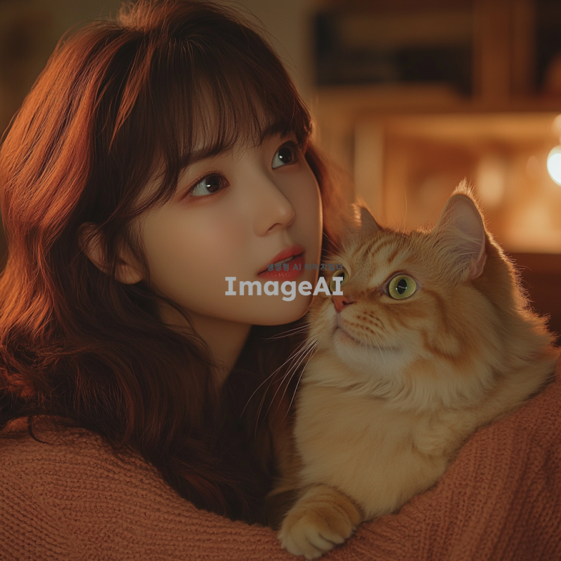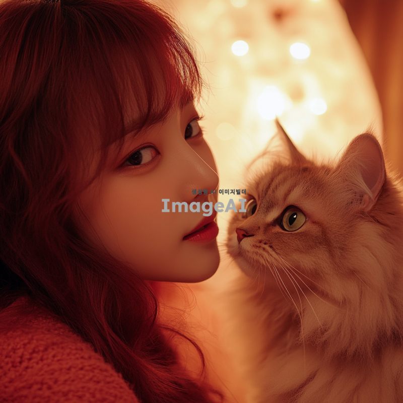 앞머리 있는 체리색 웨이브머리를 한 한국인 여성과 녹색 눈을 가진 페르시안 고양이가 함께 있는 장면. 여성은 부드러운 미소를 지으며 고양이를 애정 어린 시선으로 바라보고 있고, 고양이는 편안하게 여성의 품에 기대어 있는 모습. 배경은 아늑한 실내 공간으로, 따뜻한 조명이 비추고 있어 아늑한 분위기를 자아내고 있다.