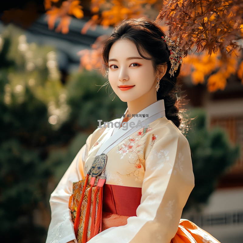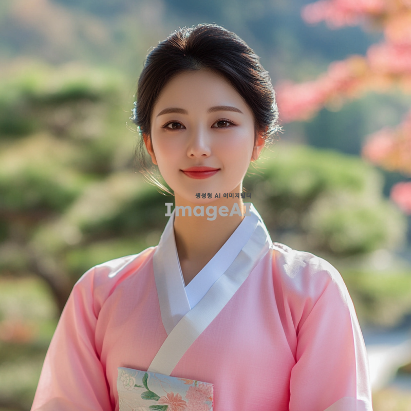 한국의 전통 의상을 입고 있는 아름다운 여성, 우아한 포즈, 부드러운 조명 아래에서 화사한 미소를 지닌 모습, 배경에는 한국의 고전적인 정원 풍경이 어우러져 있는 장면.