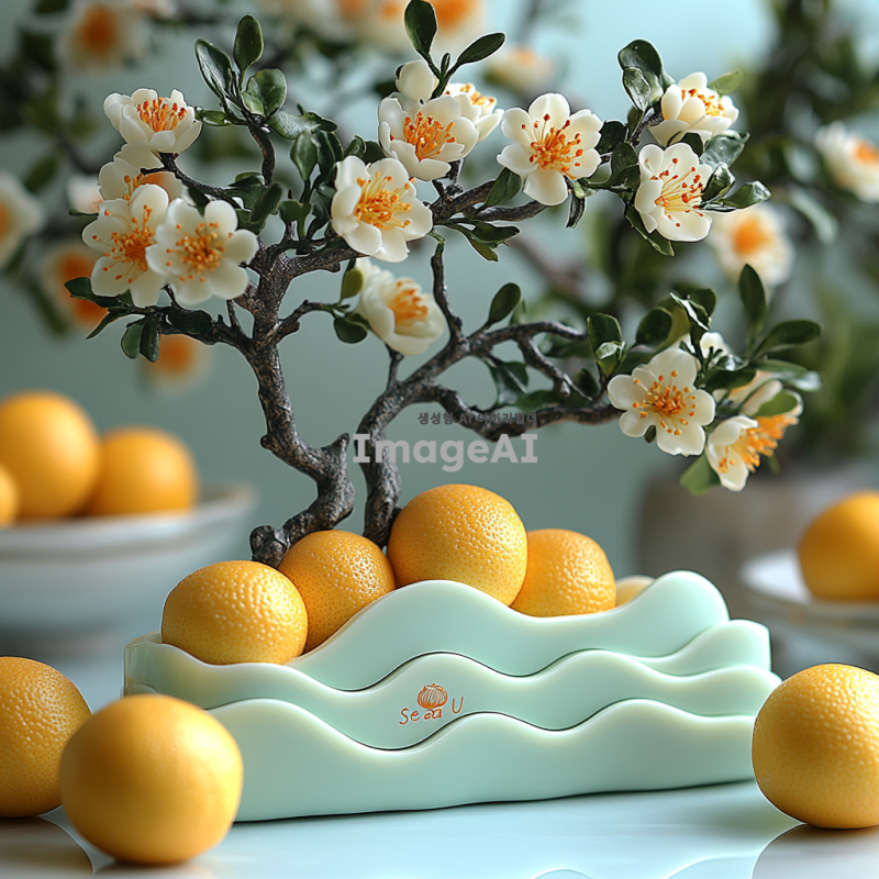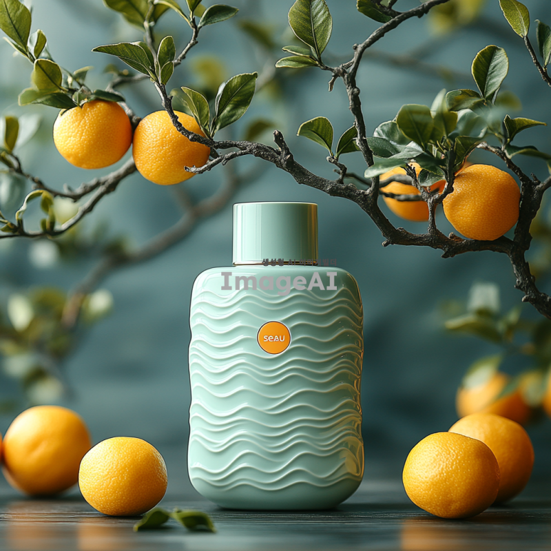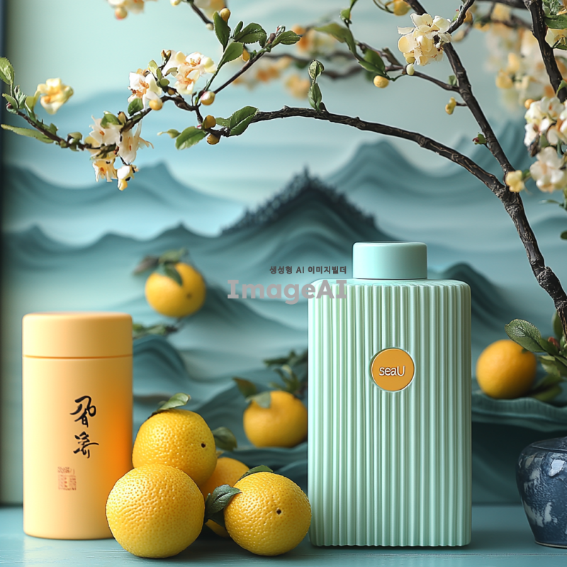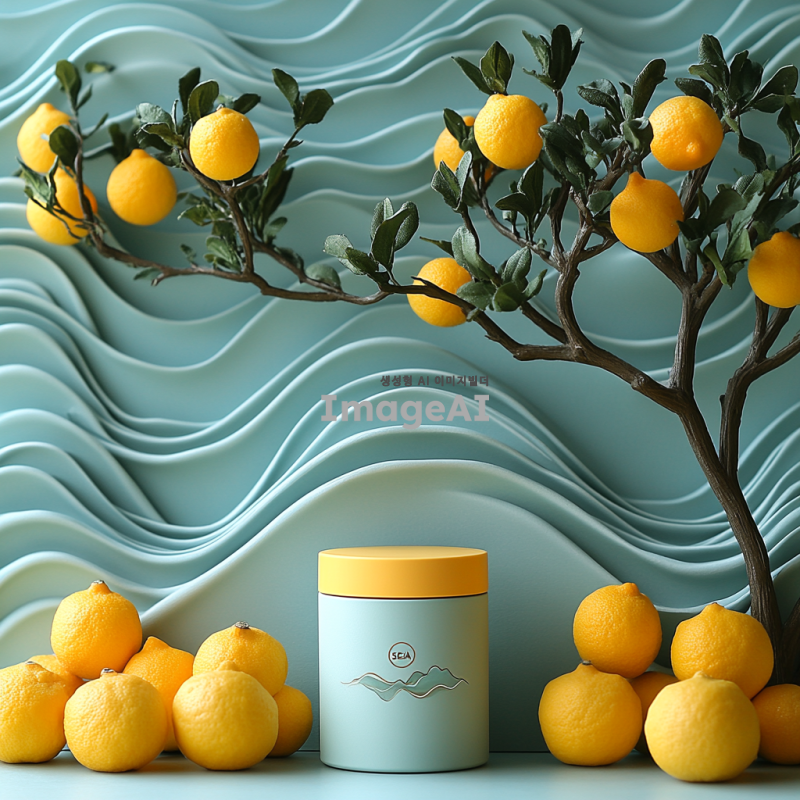 남해 바다의 푸른빛을 배경으로, 곡선으로 형성된 물결 모양의 립밤 케이스를 디자인합니다. 케이스에는 한 그루의 유자나무가 그려져 있으며, 나무에는 유자가 가득 맺혀 있습니다. 전체적인 색상은 차분한 파스텔톤의 파란색과 활기찬 노란색이 조화를 이루도록 구성합니다. 케이스의 디자인에 어울리는 'seaU'라는 립밤 이름의 로고를 적절한 위치에 배치하여 세련된 느낌을 강조합니다.