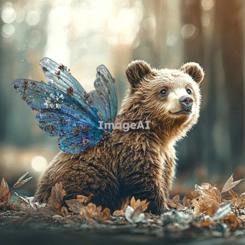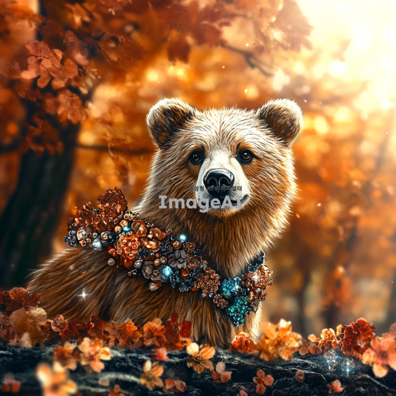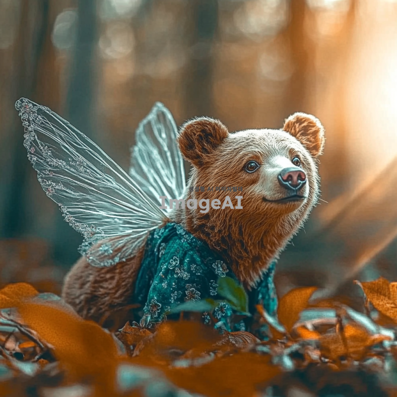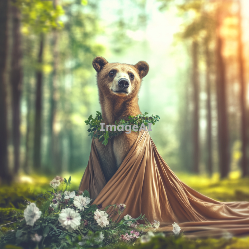 선녀옷을 입고 있는 귀여운 곰이 평화로운 숲속에 서 있는 모습, 햇살이 비추는 따뜻한 분위기, 꽃들과 나무들이 어우러진 아름다운 배경, 곰의 표정은 사랑스럽고 순수하며, 선녀옷의 화려한 색상과 디테일이 잘 보이도록.